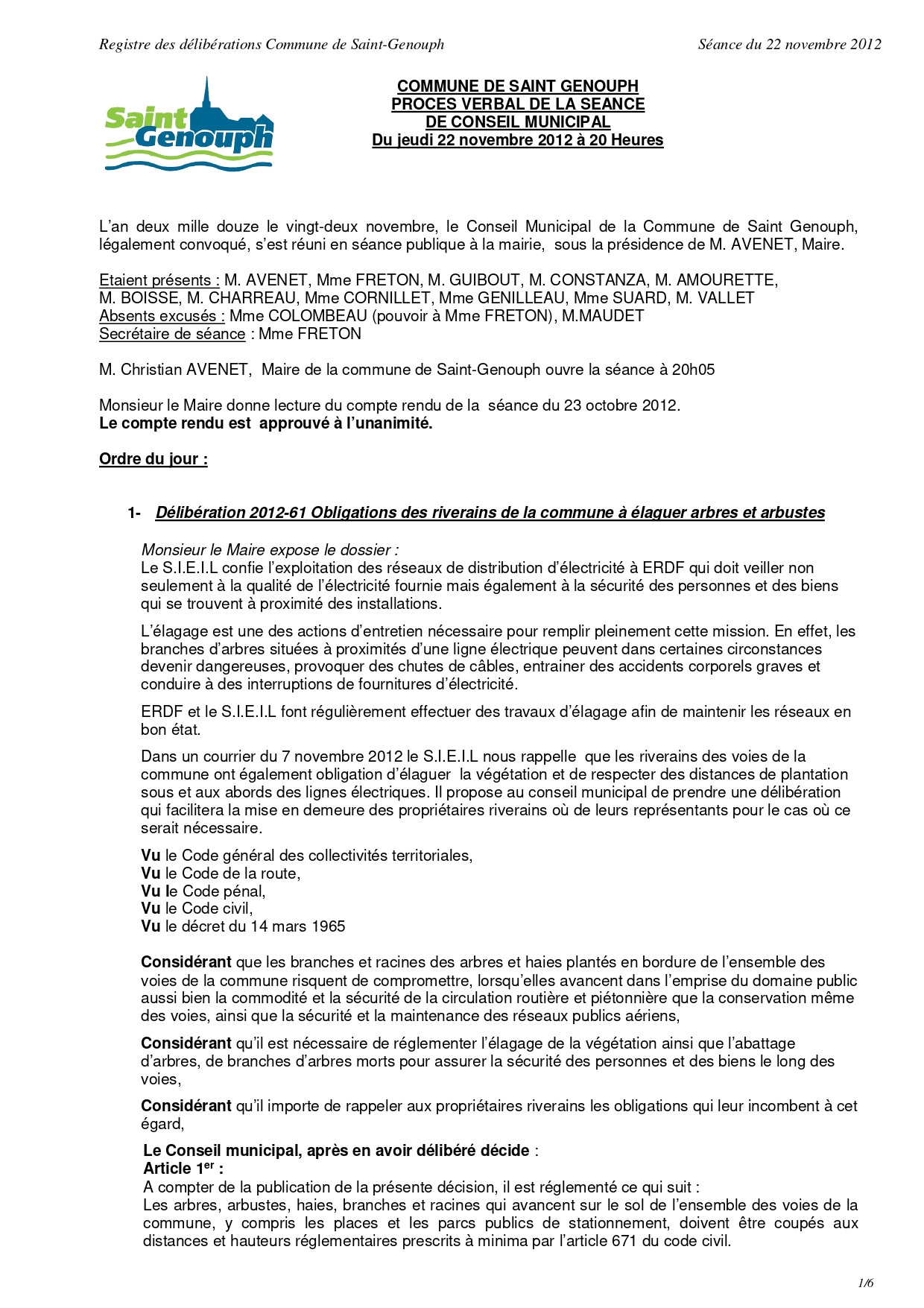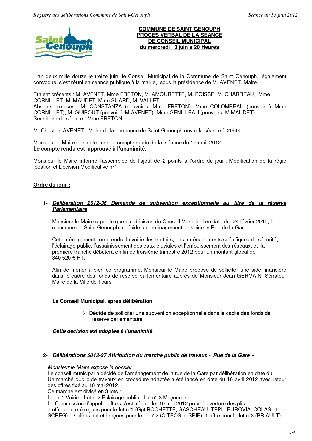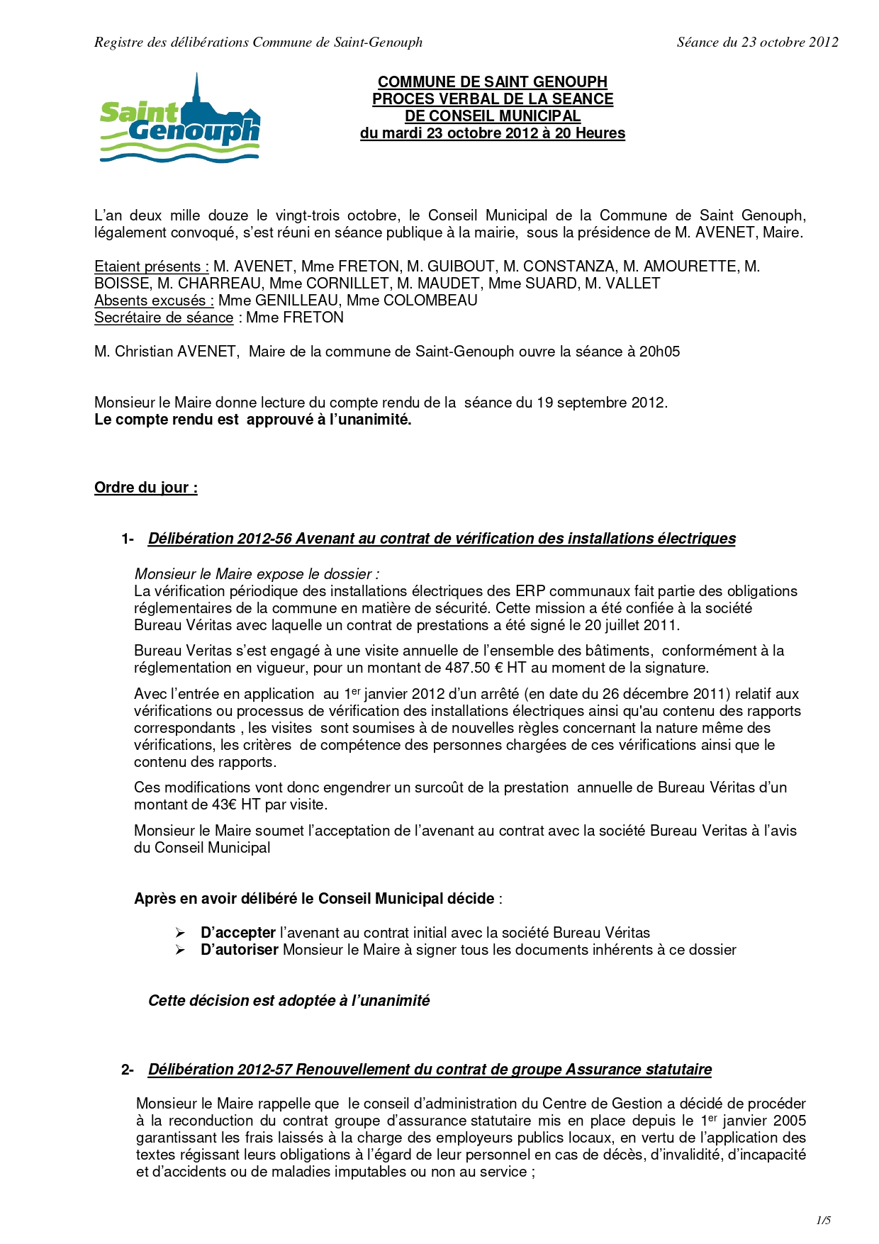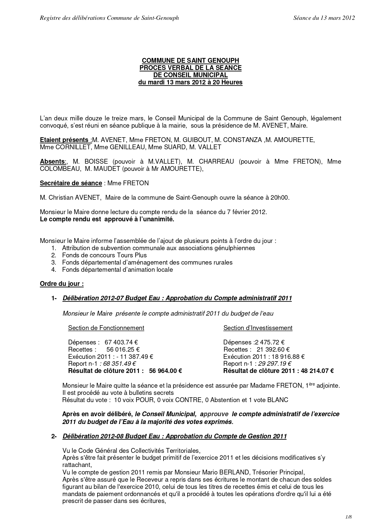 L'année 2012 : conseils municipaux de la commune de St Genouph