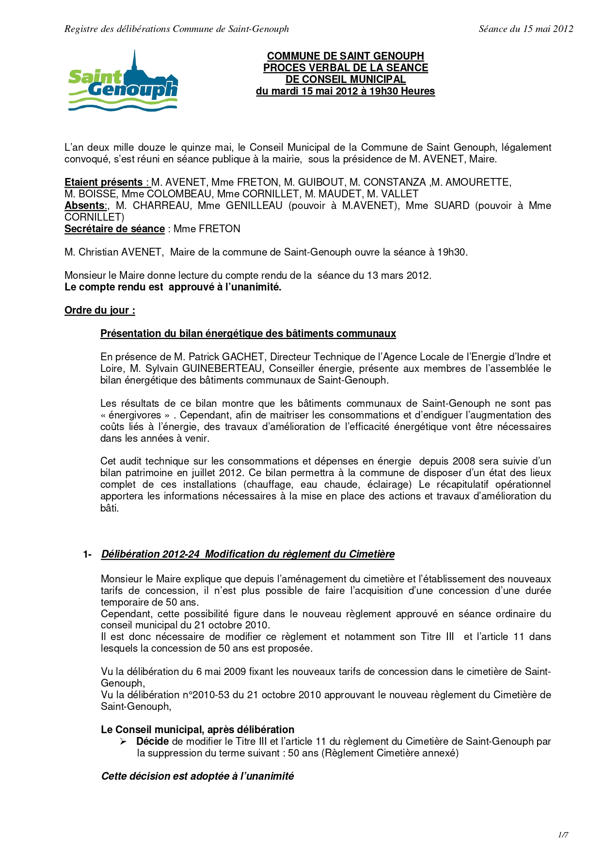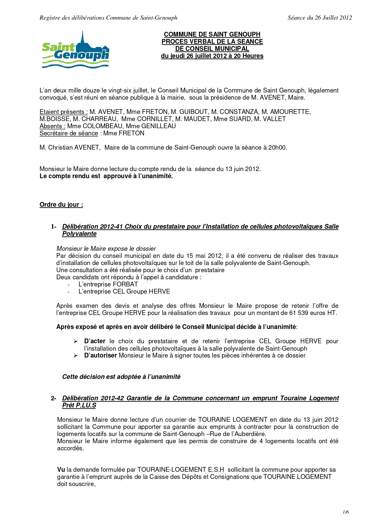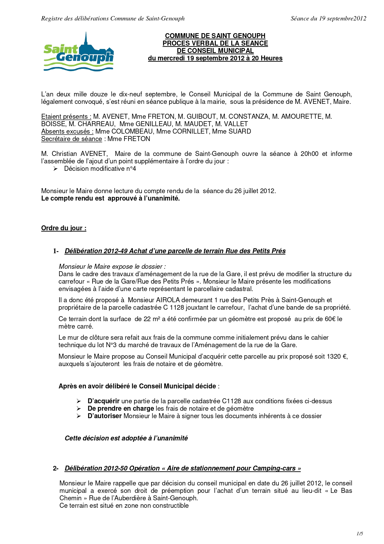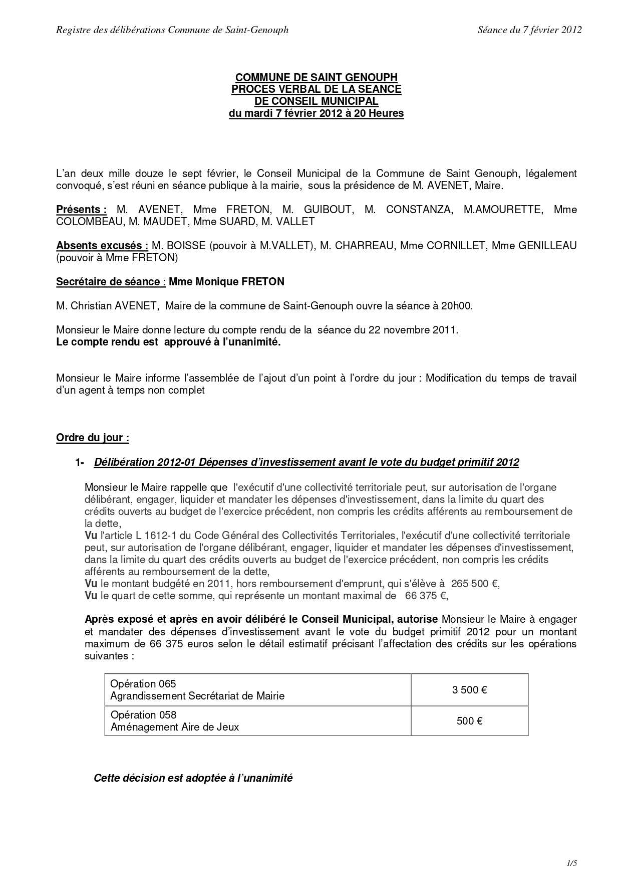 L'année 2012 : conseils municipaux de la commune de St Genouph