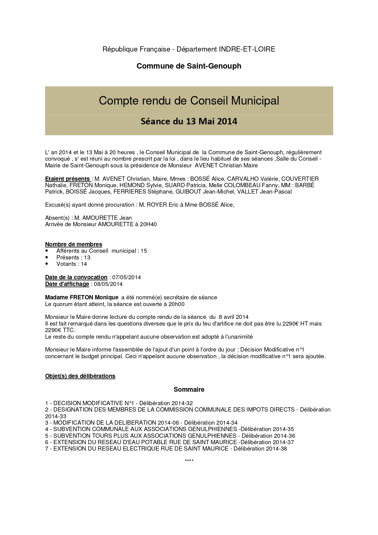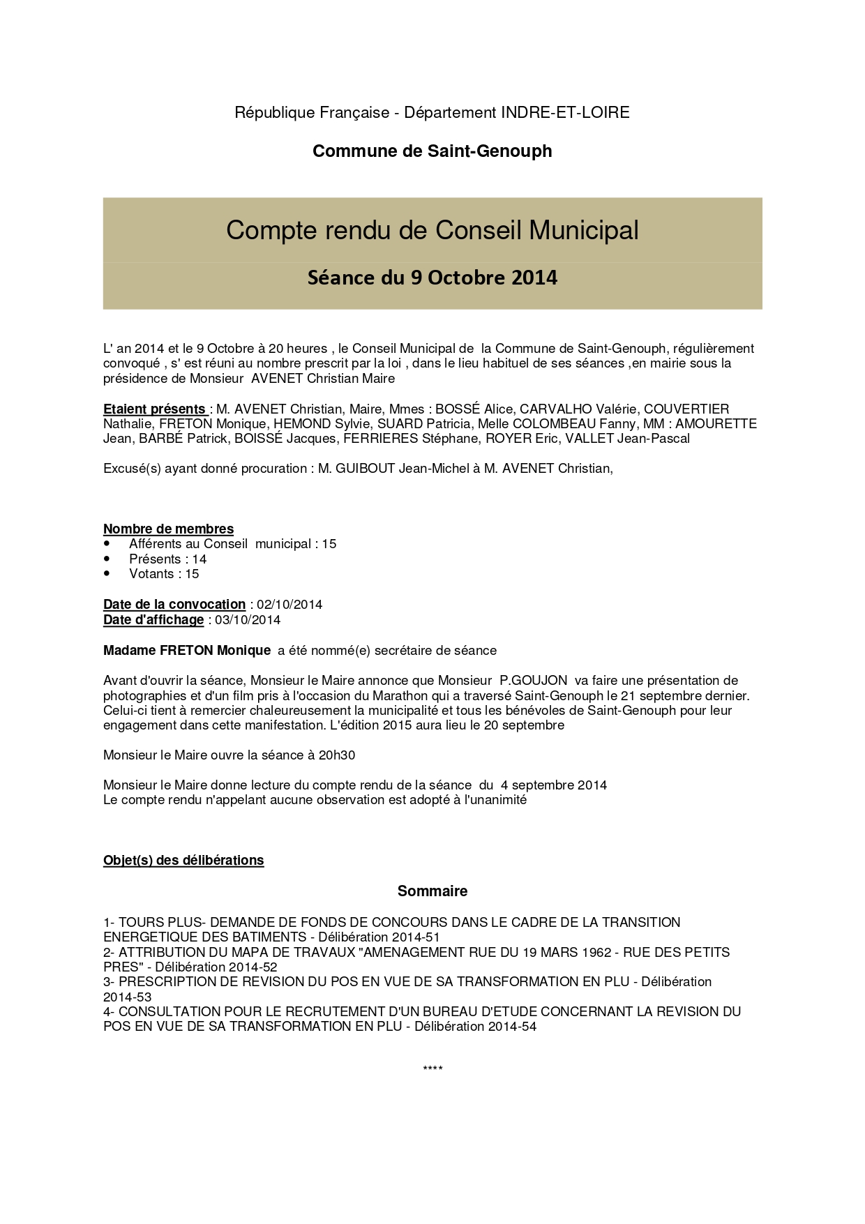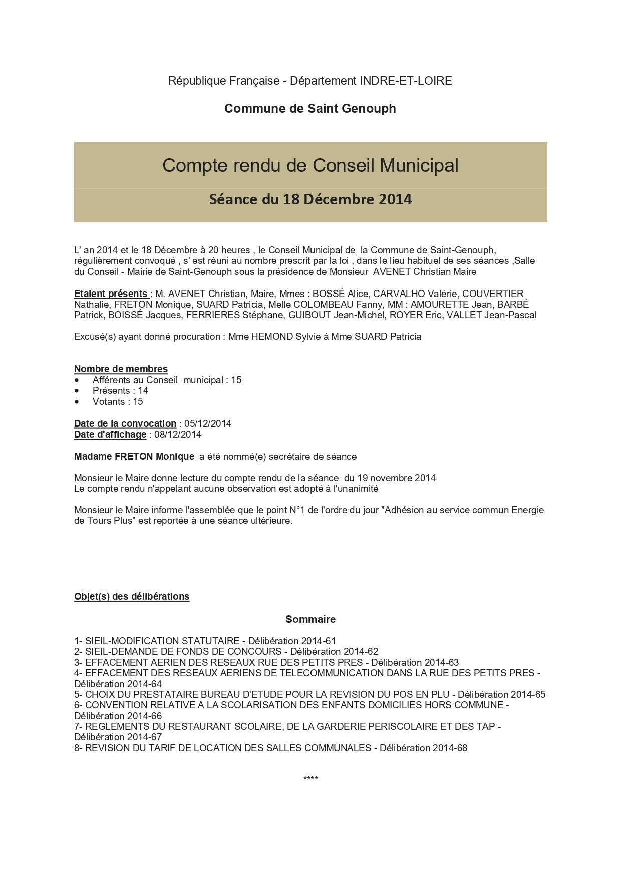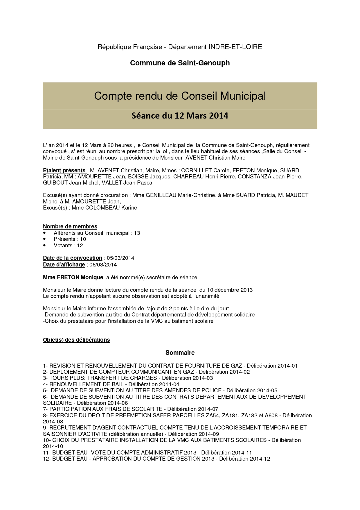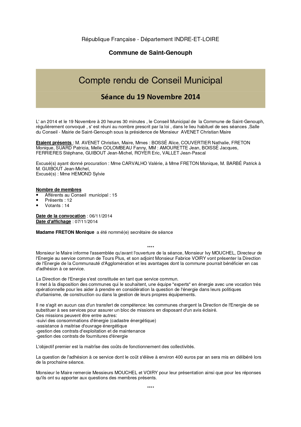 L'année 2014 : conseils municipaux de la commune de St Genouph