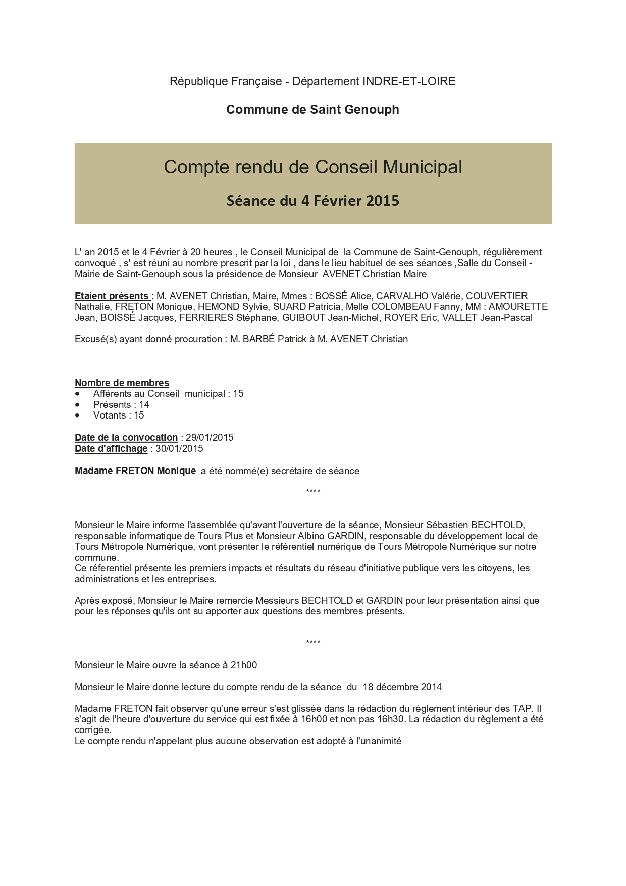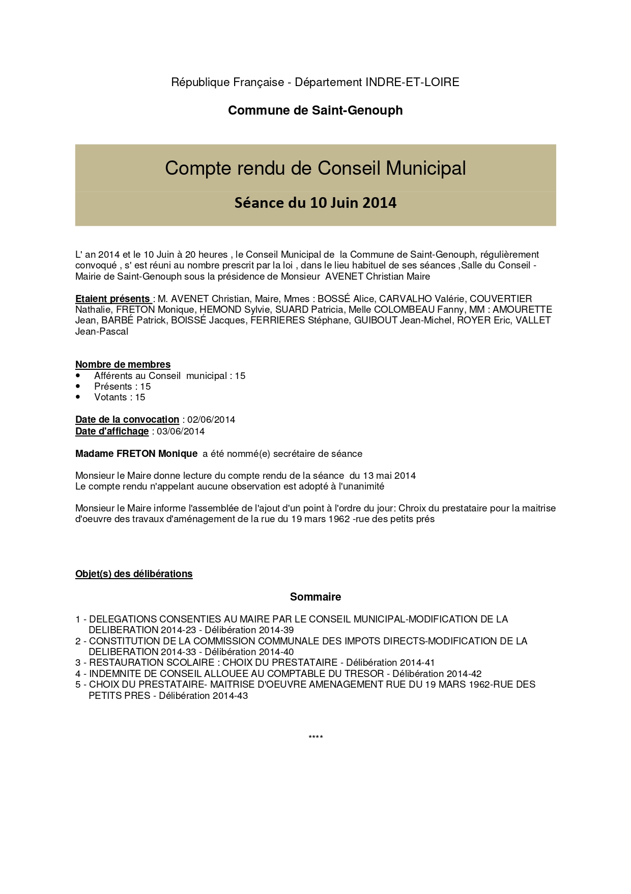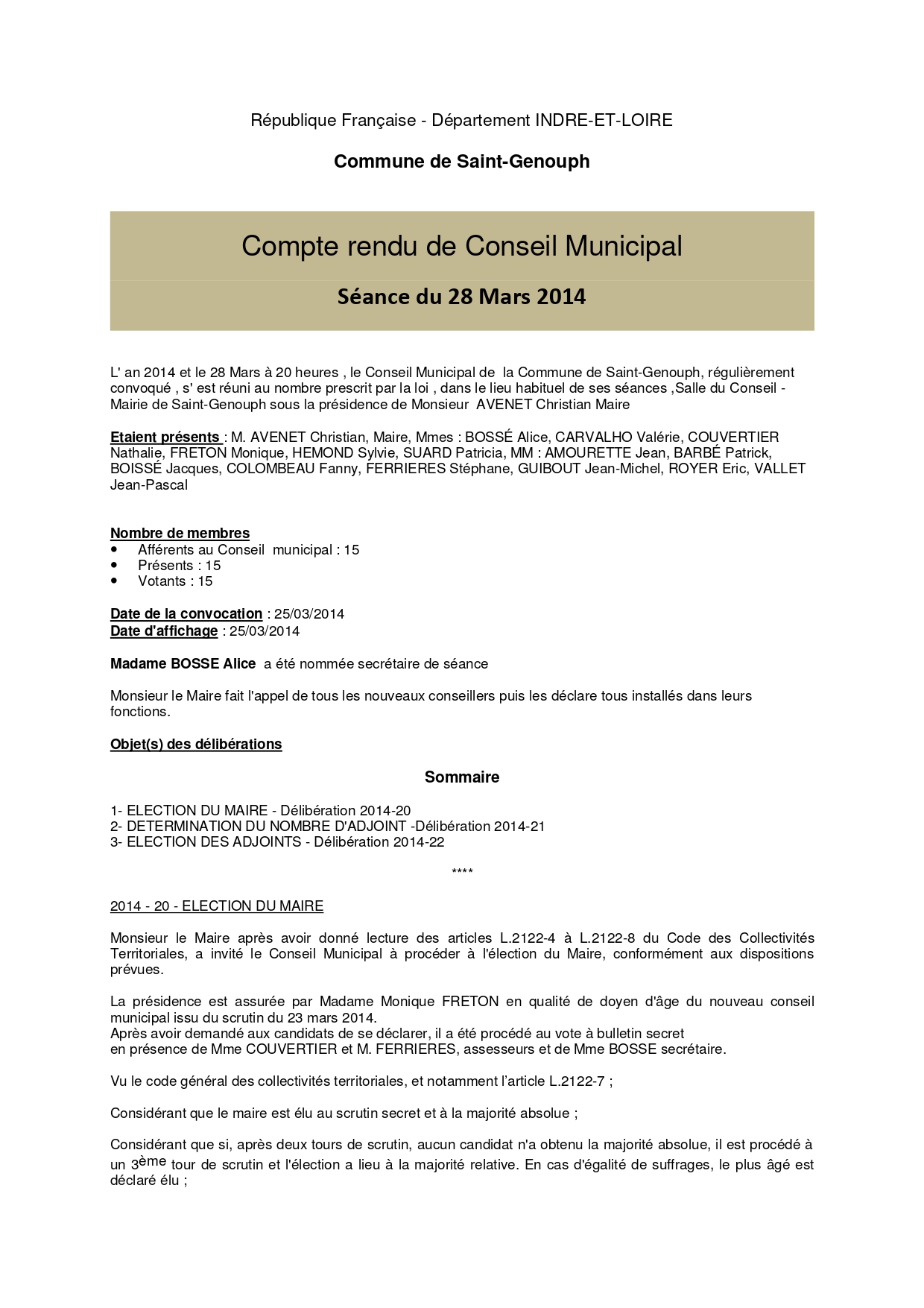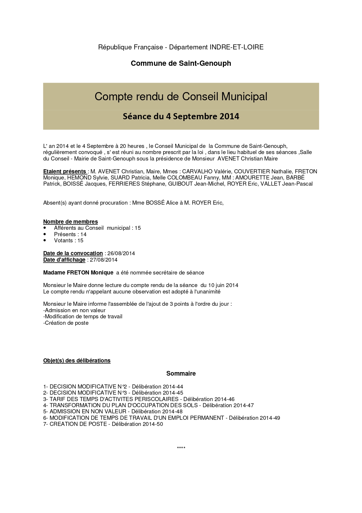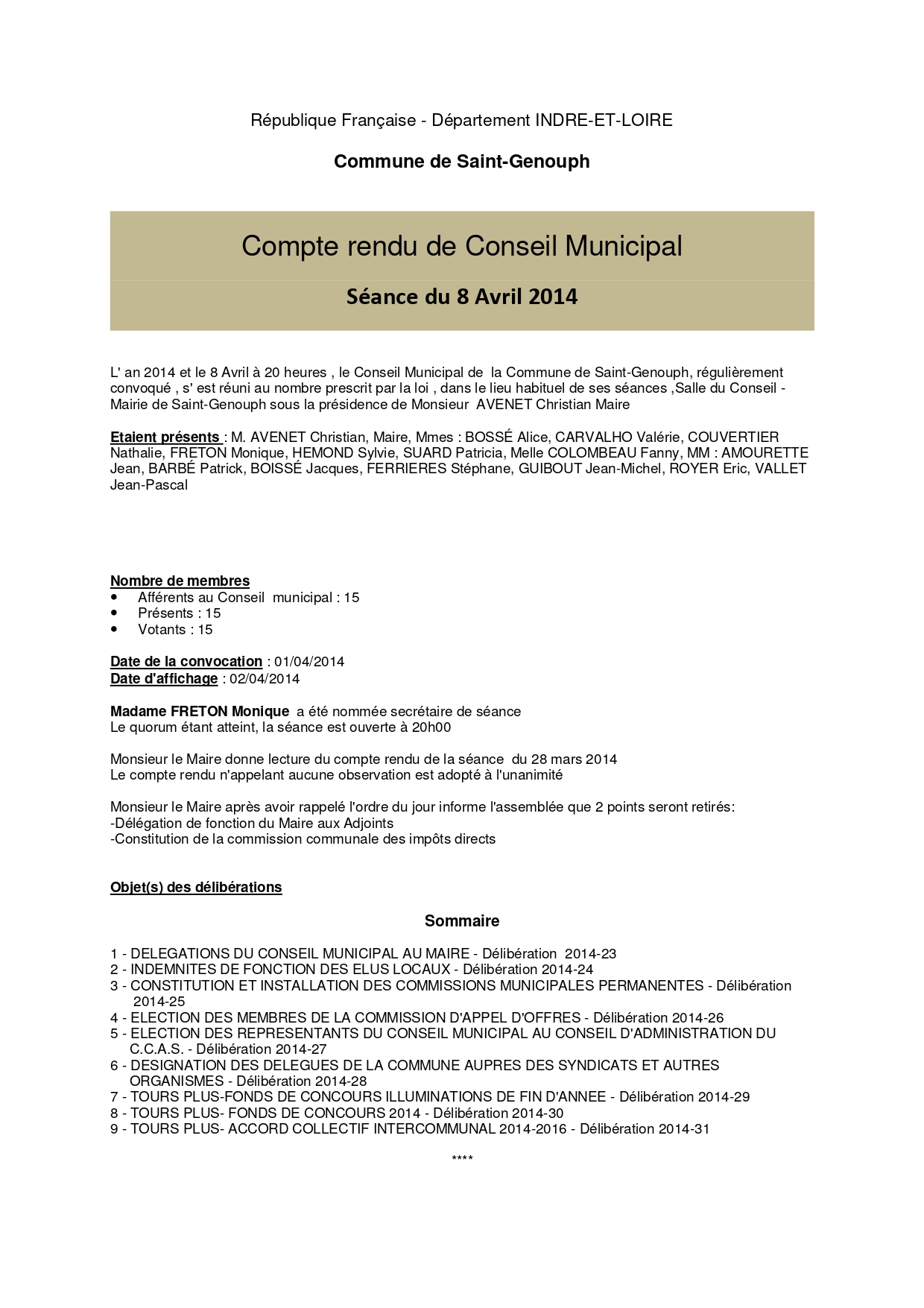 L'année 2014 : conseils municipaux de la commune de St Genouph