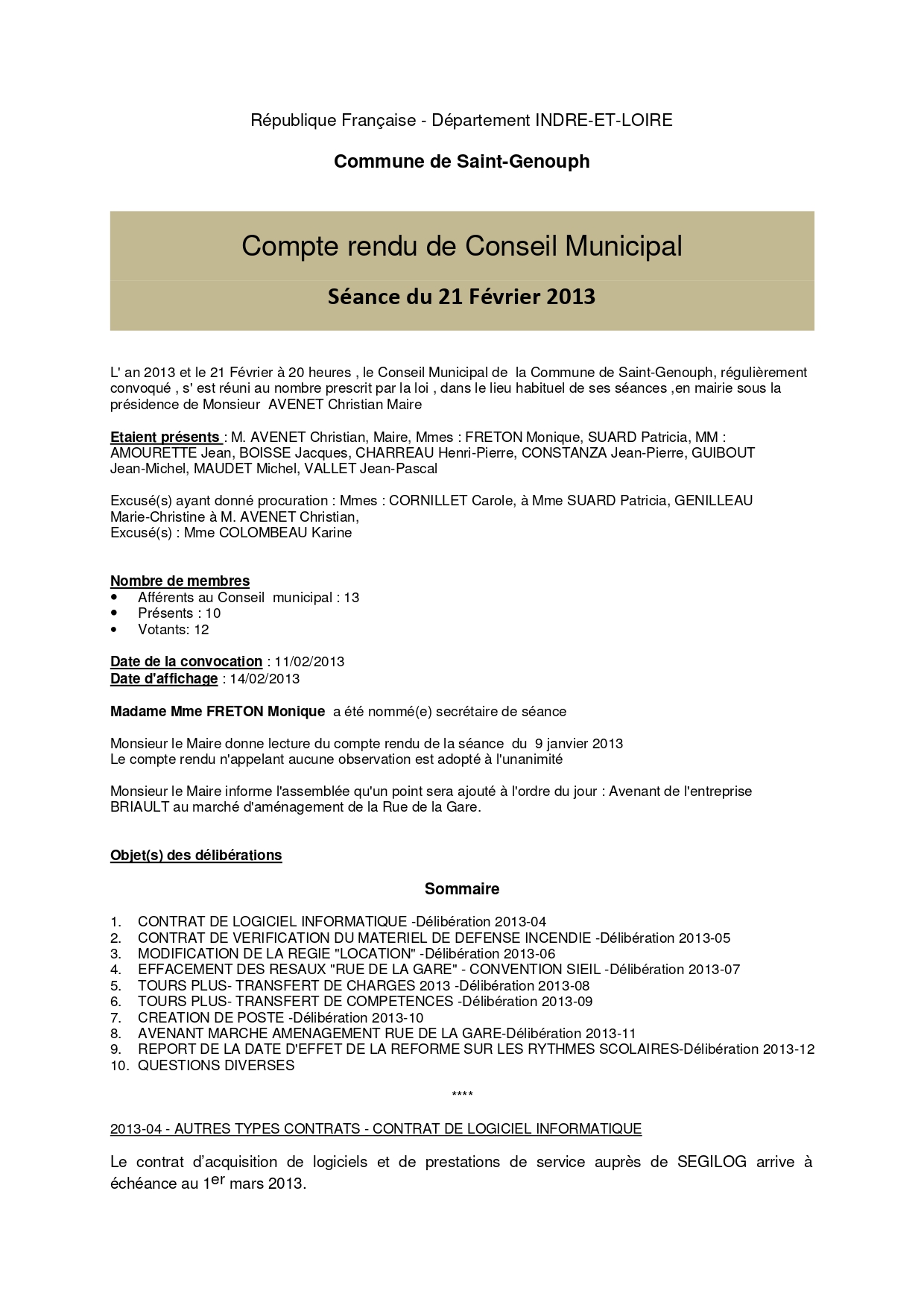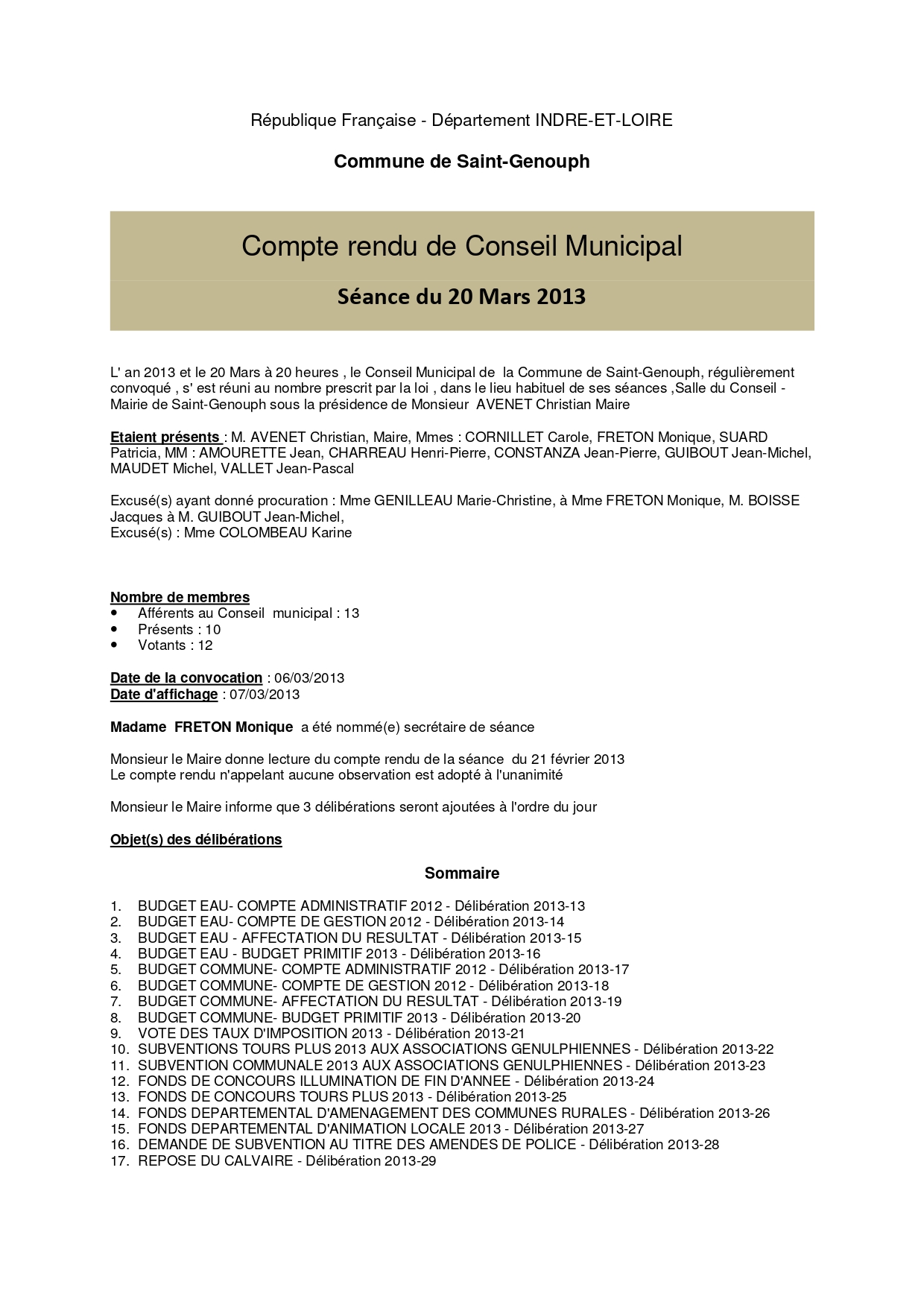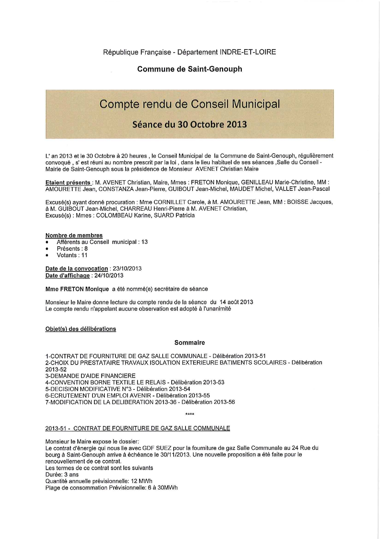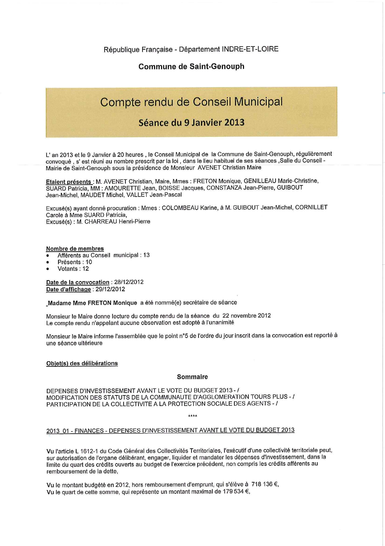 L'année 2013 : conseils municipaux de la commune de St Genouph