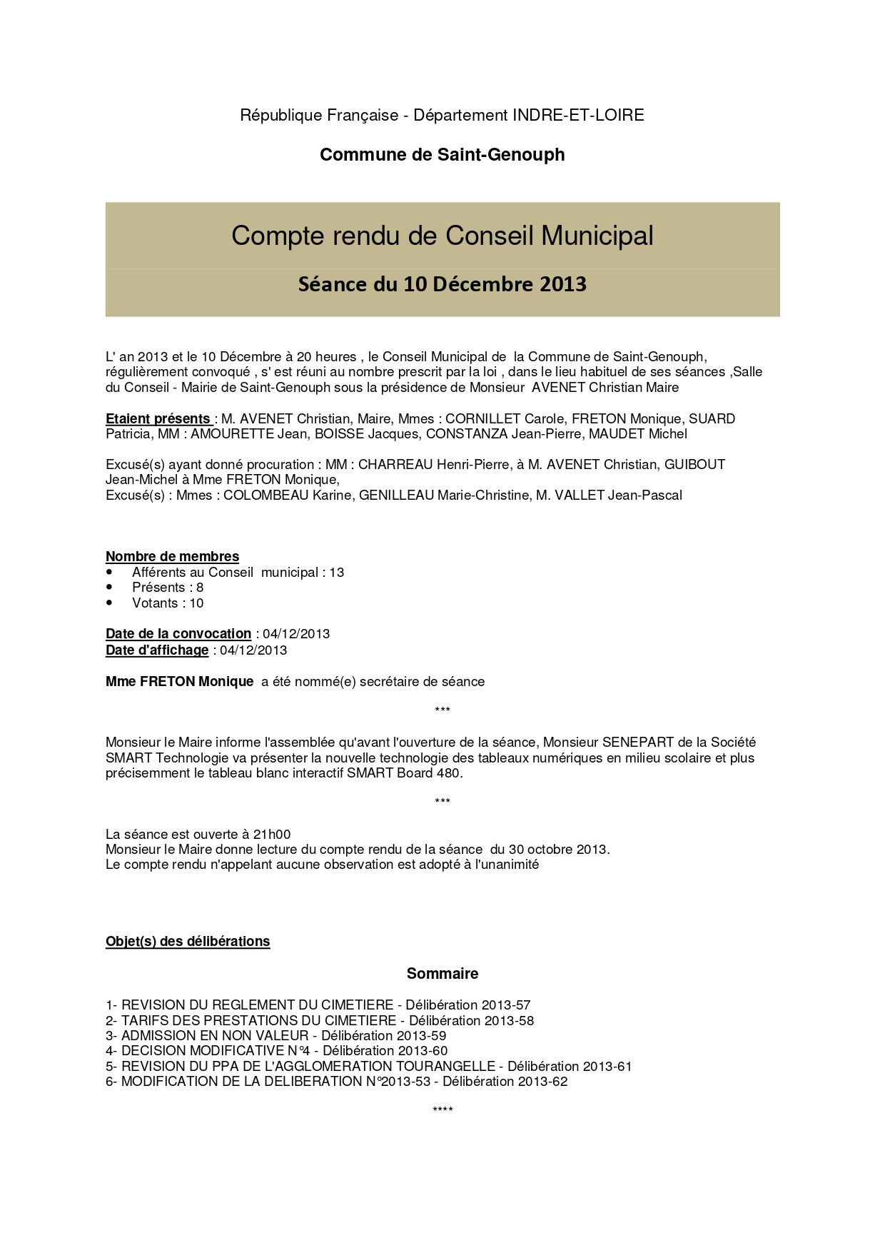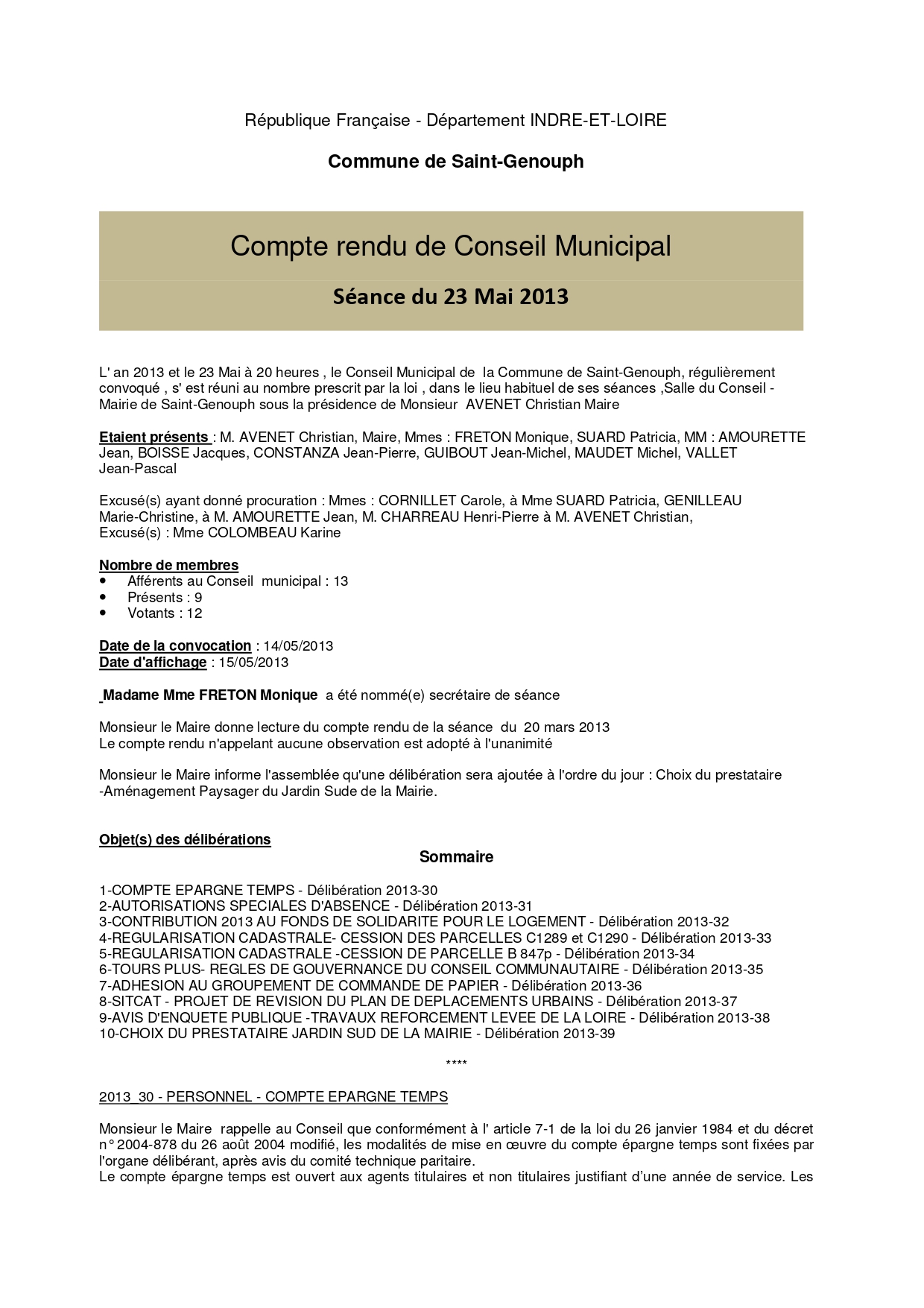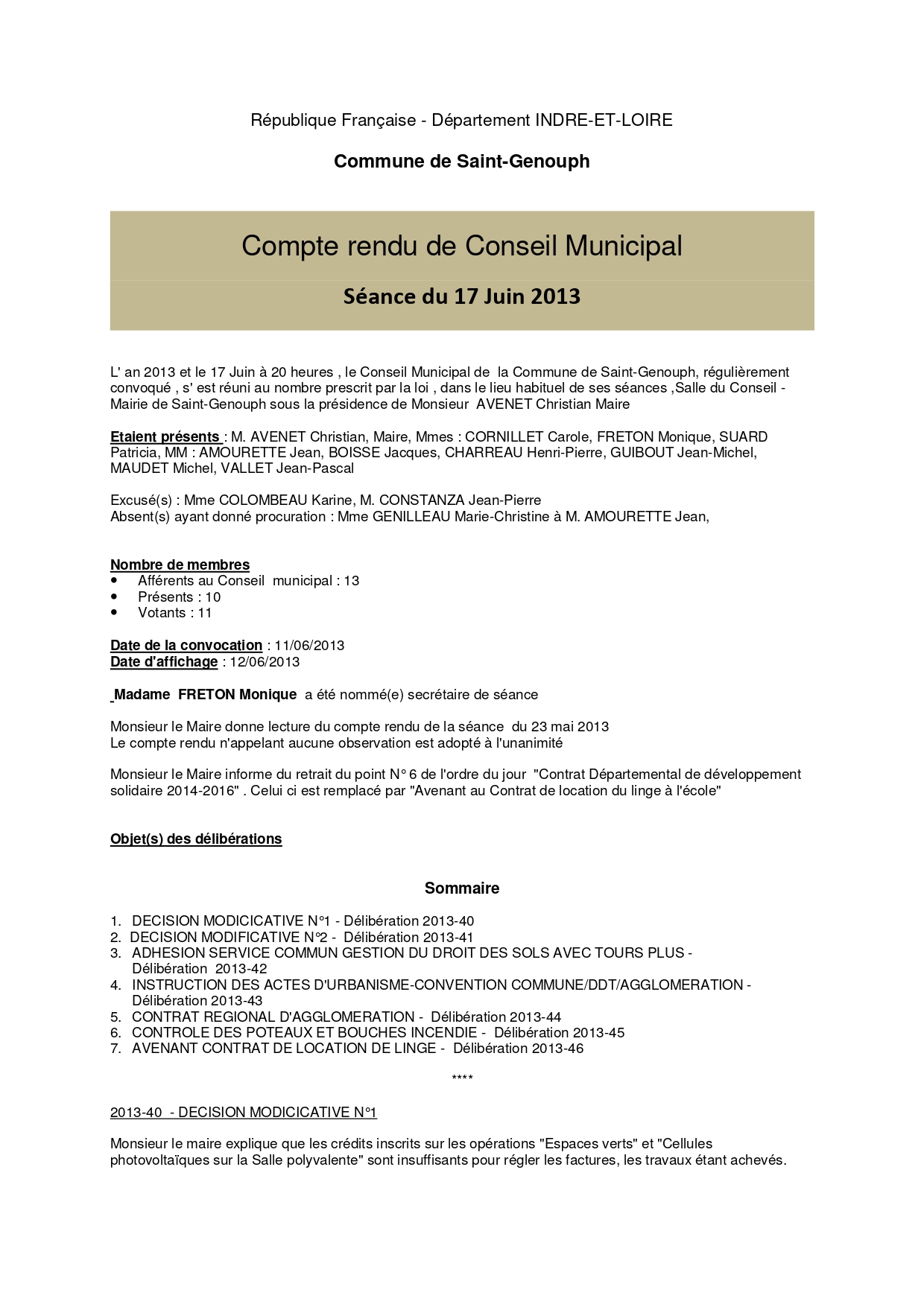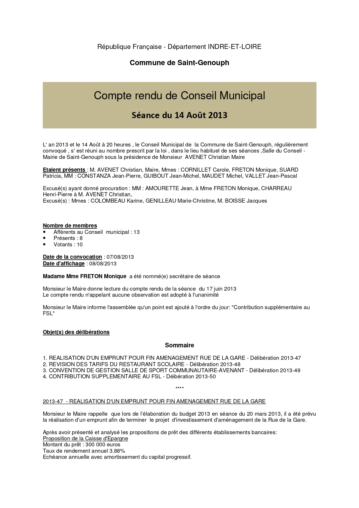 L'année 2013 : conseils municipaux de la commune de St Genouph