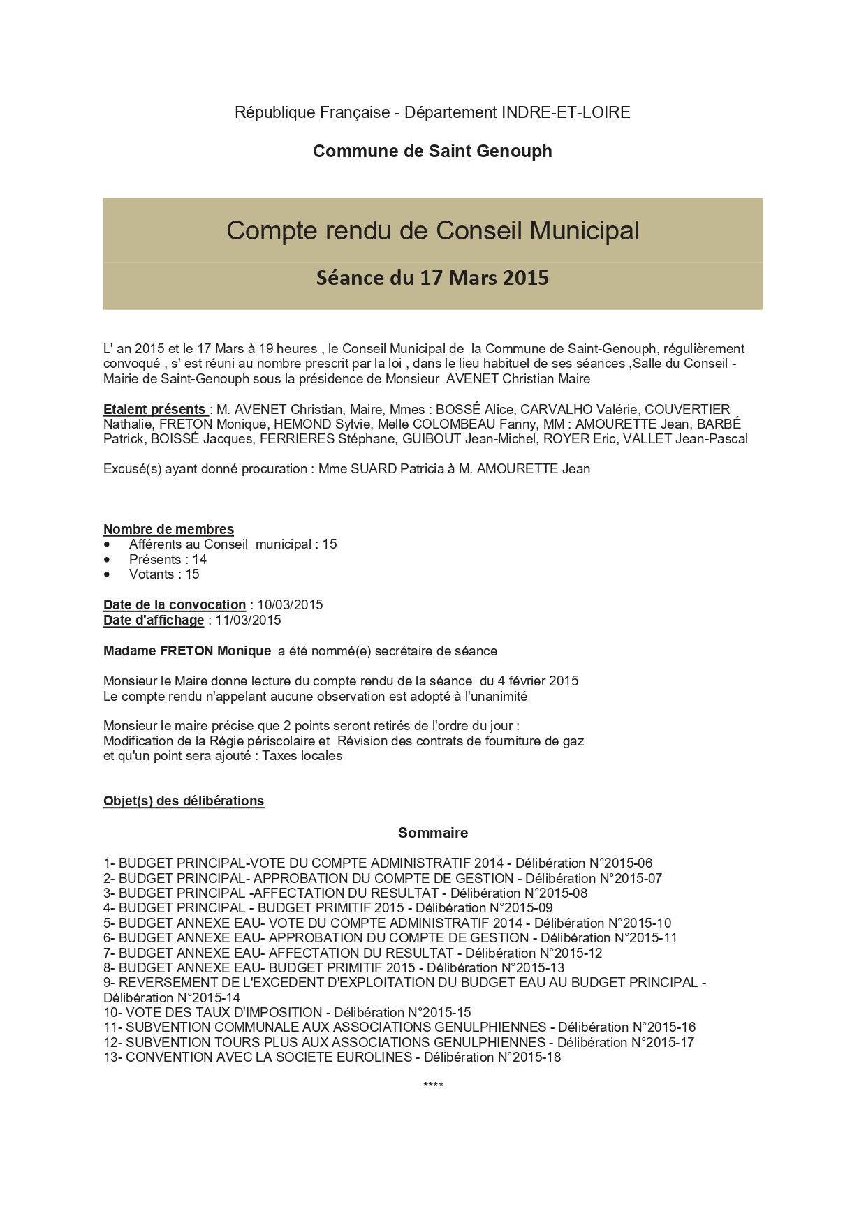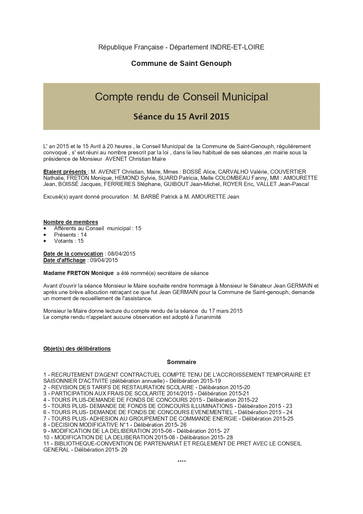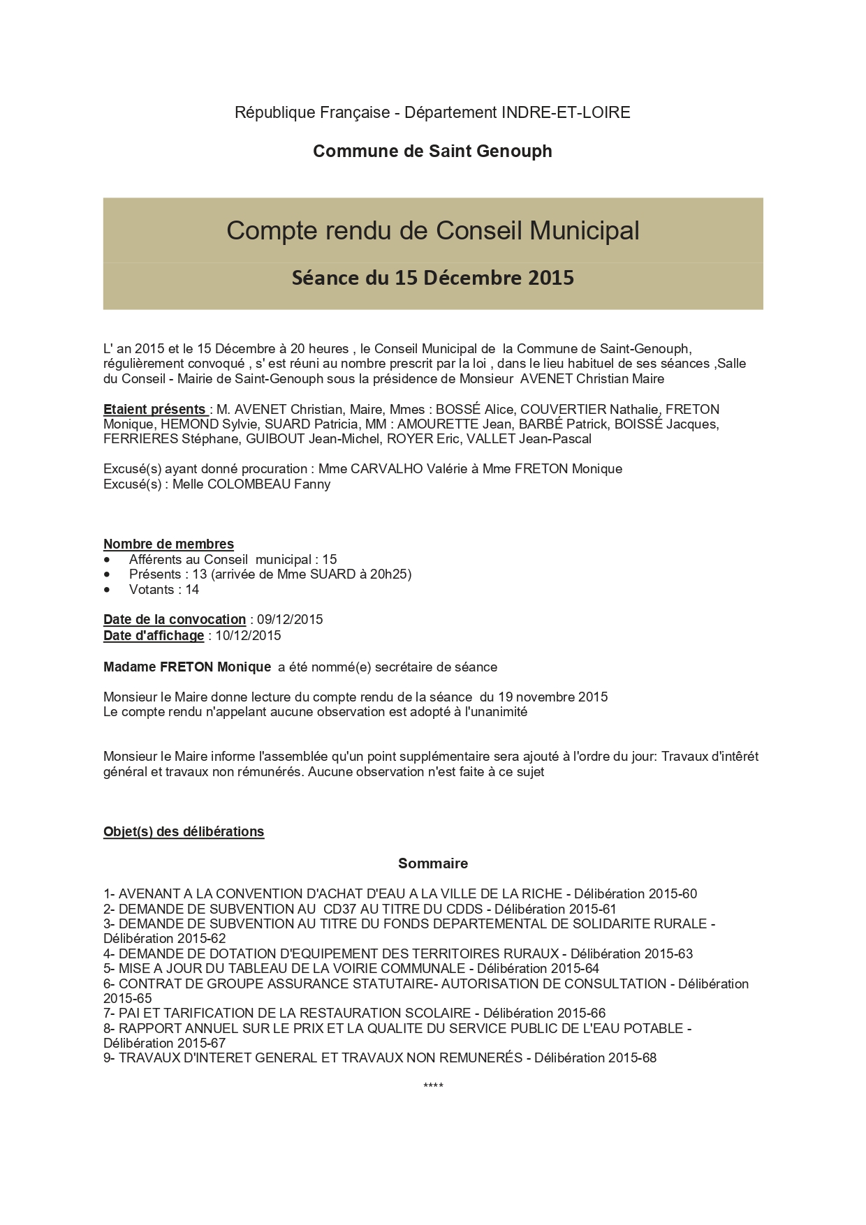 L'année 2015 : conseils municipaux de la commune de St Genouph