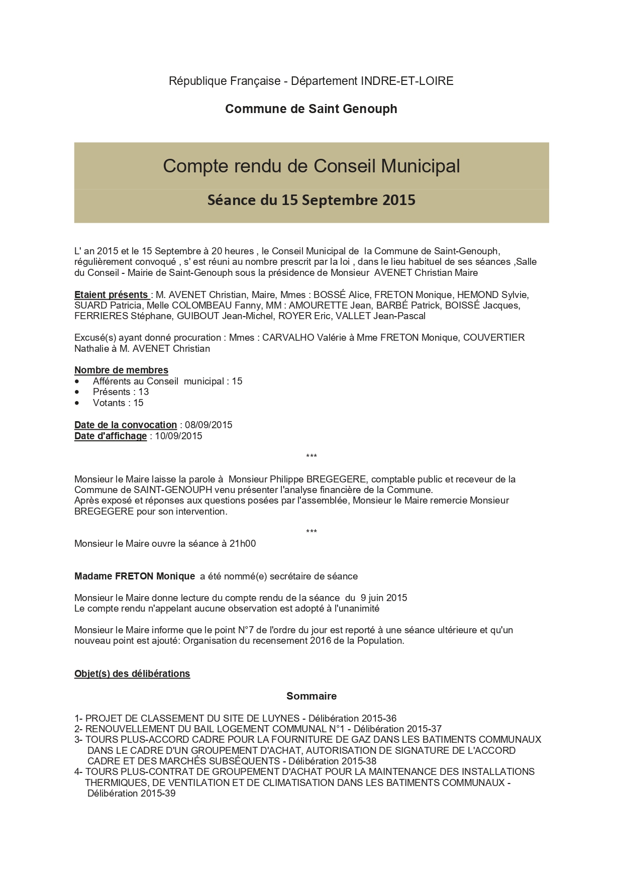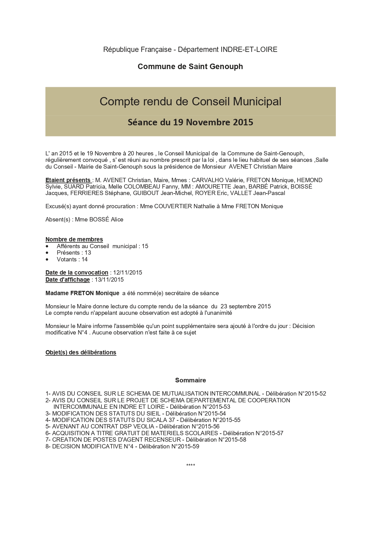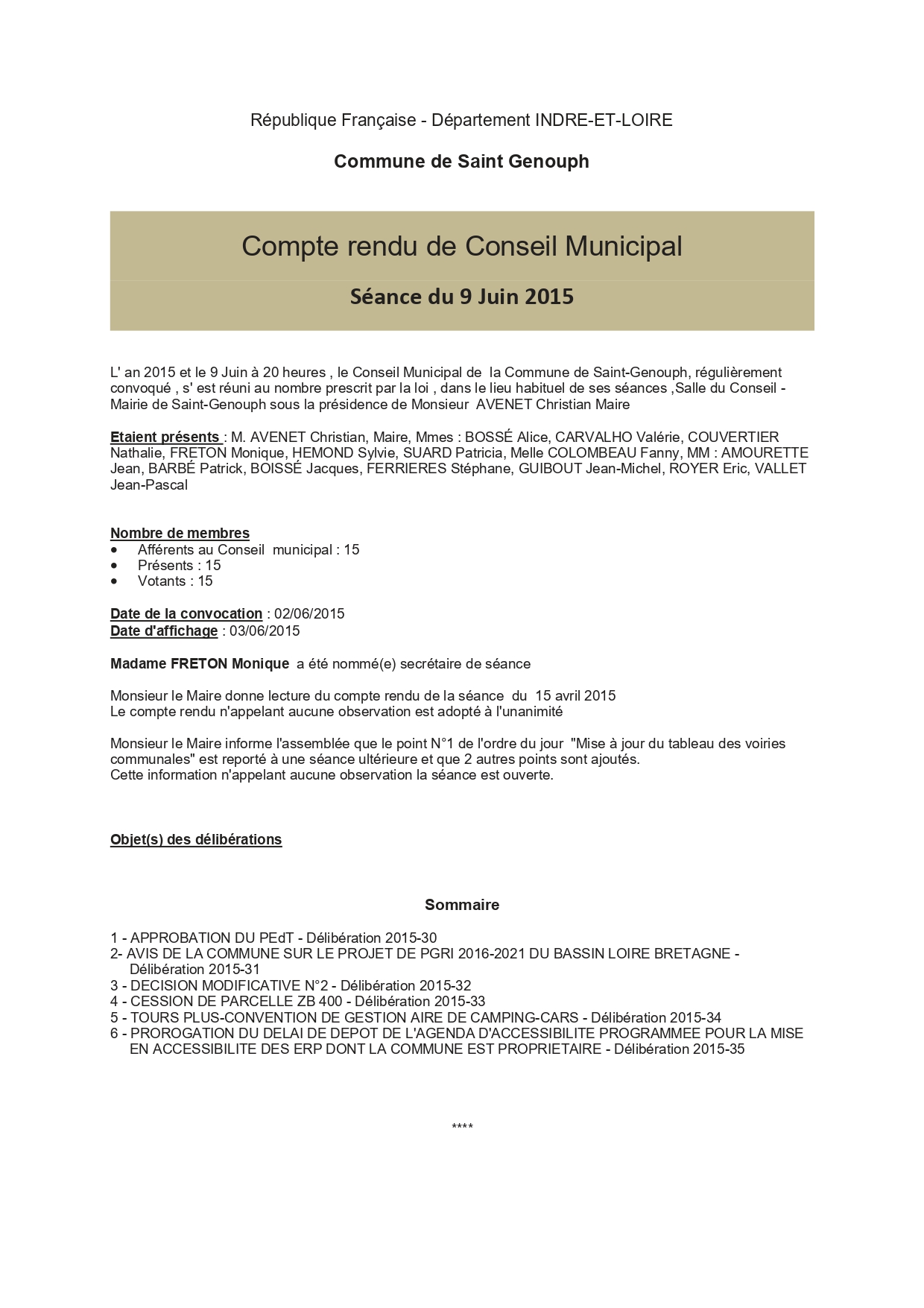 L'année 2015 : conseils municipaux de la commune de St Genouph