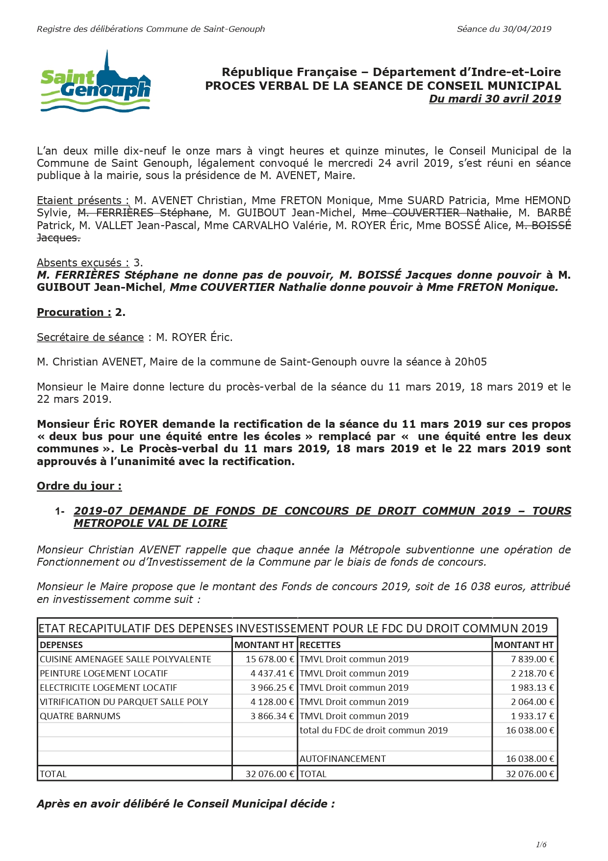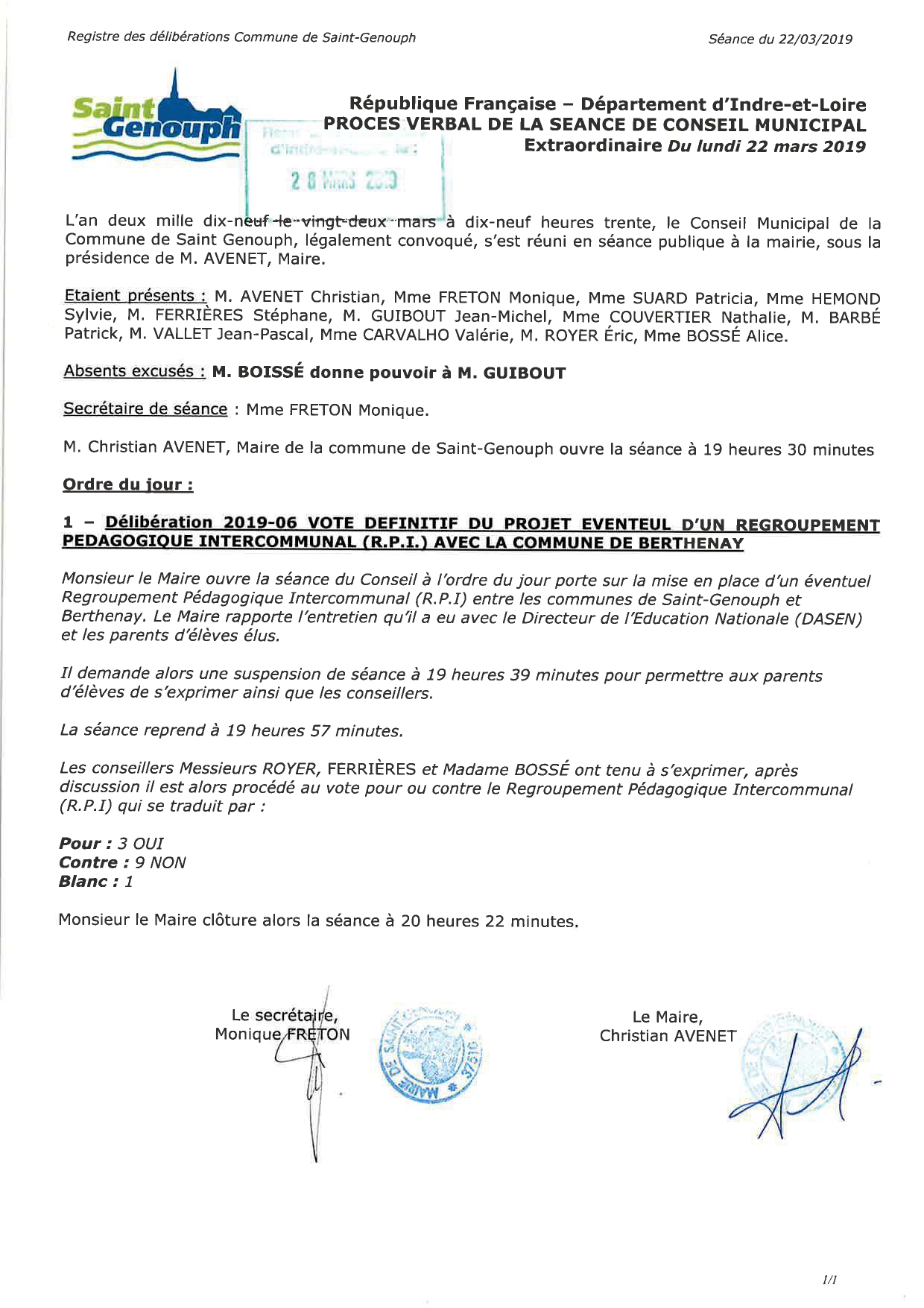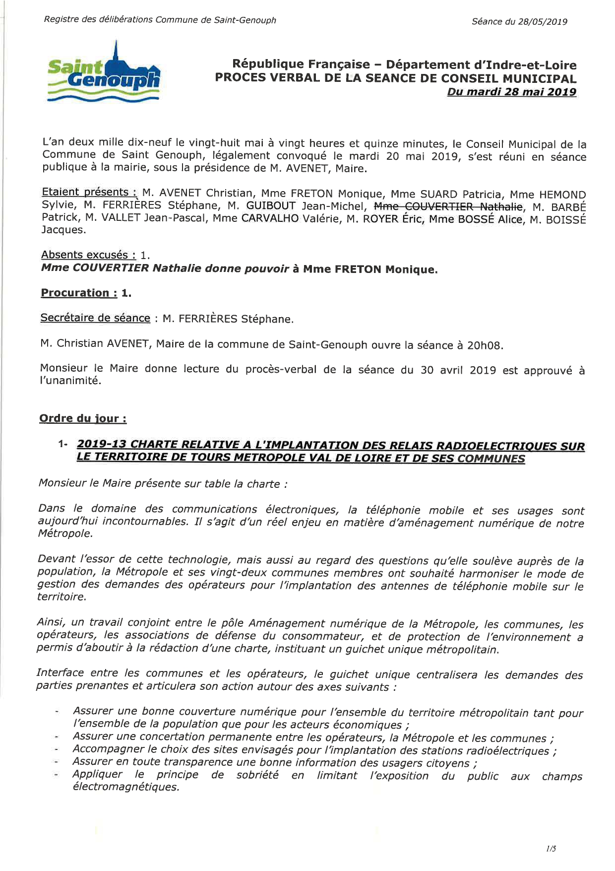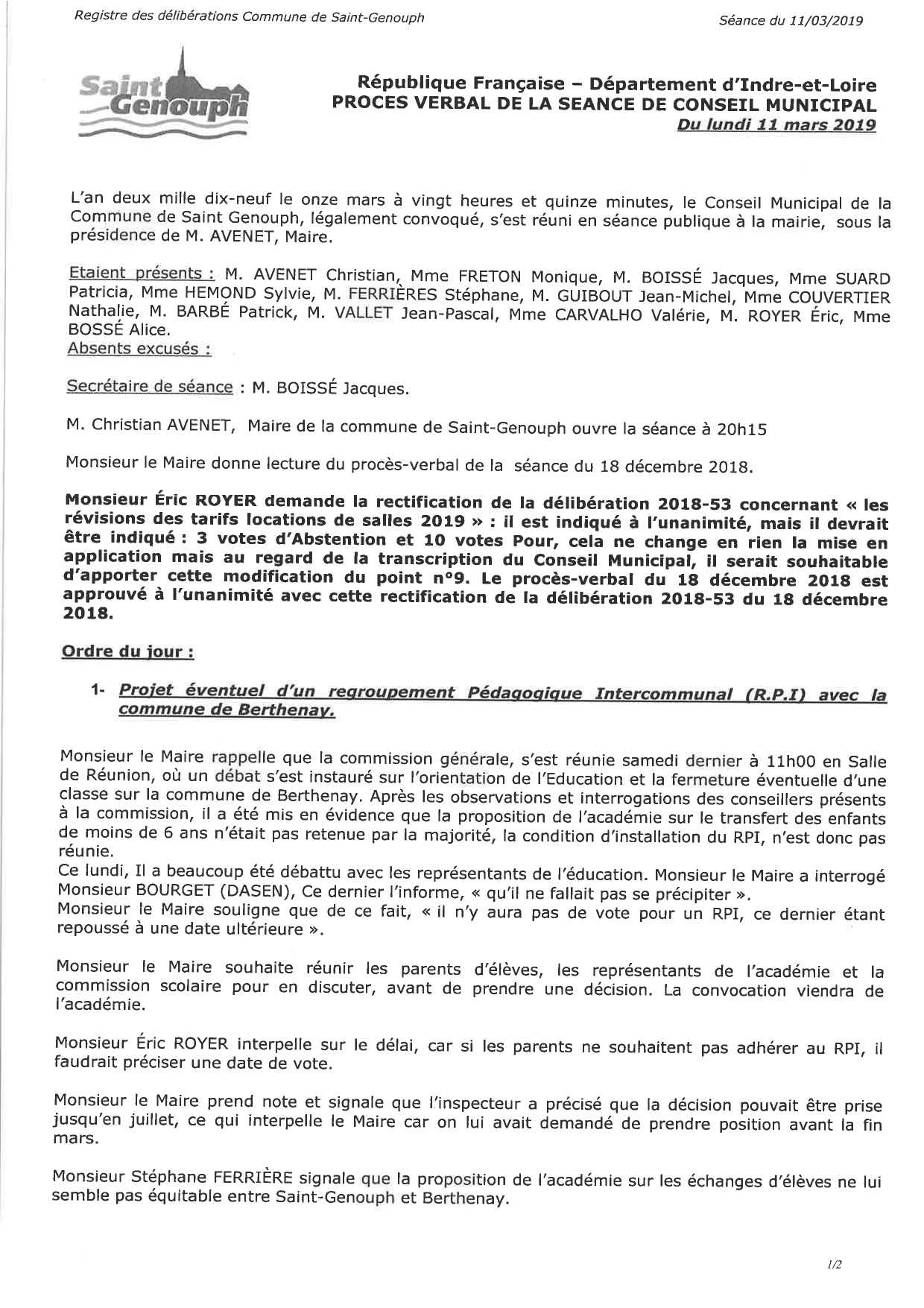 L'année 2019 : conseils municipaux de la commune de St Genouph