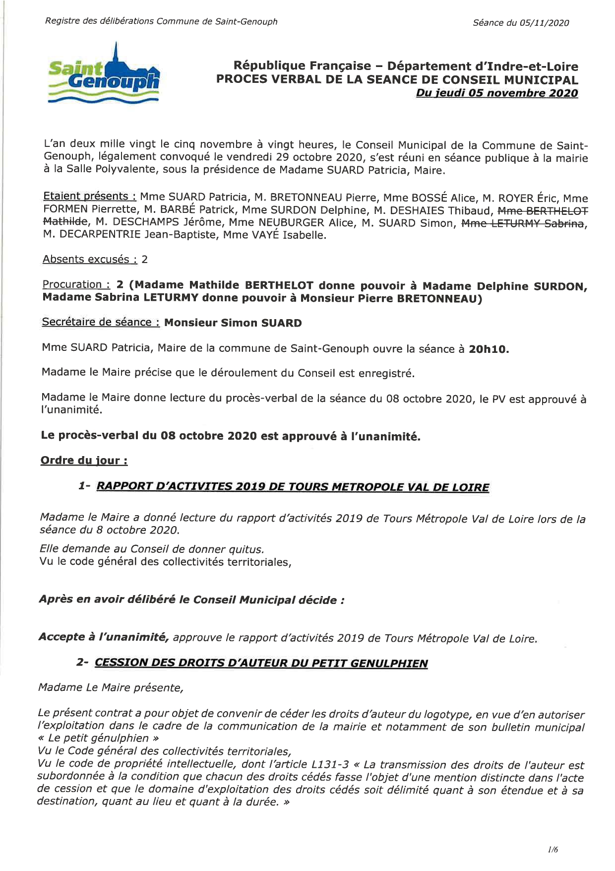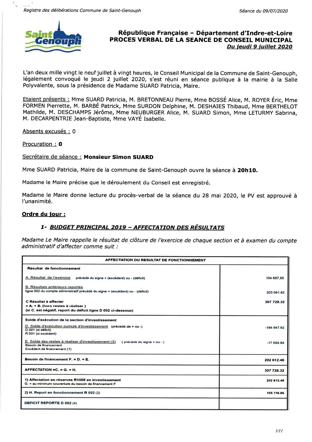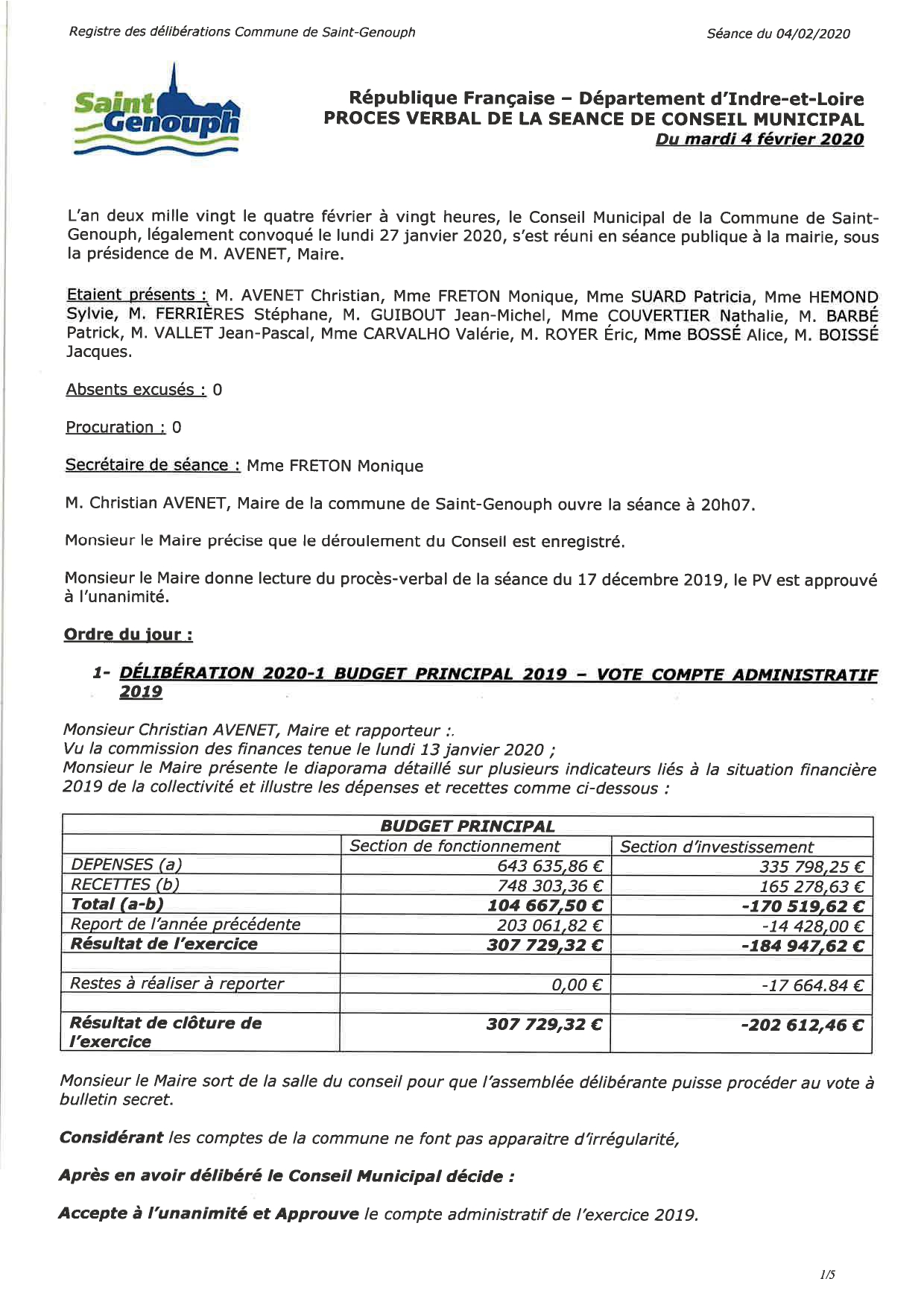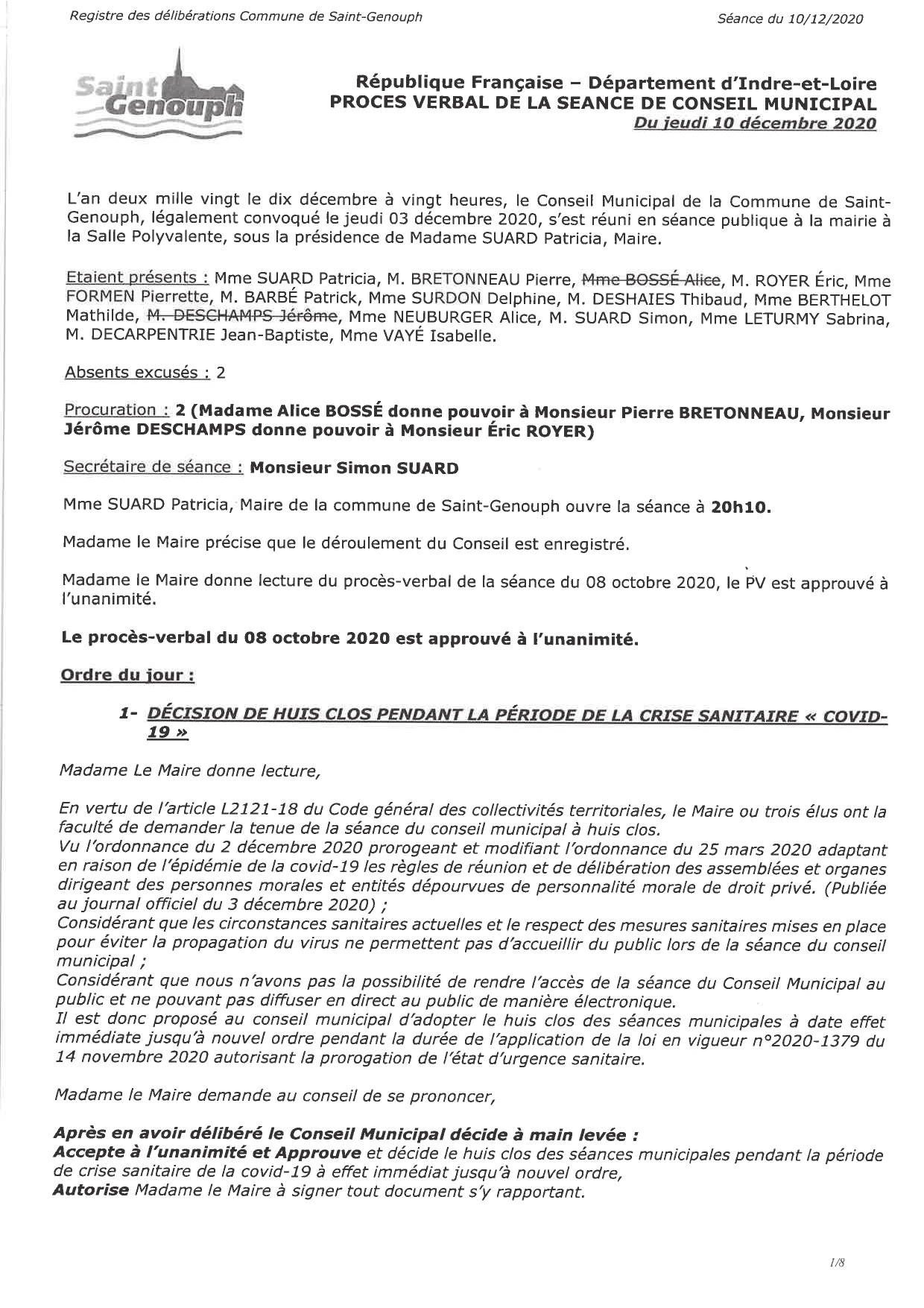 L'année 2020 : conseils municipaux de la commune de St Genouph