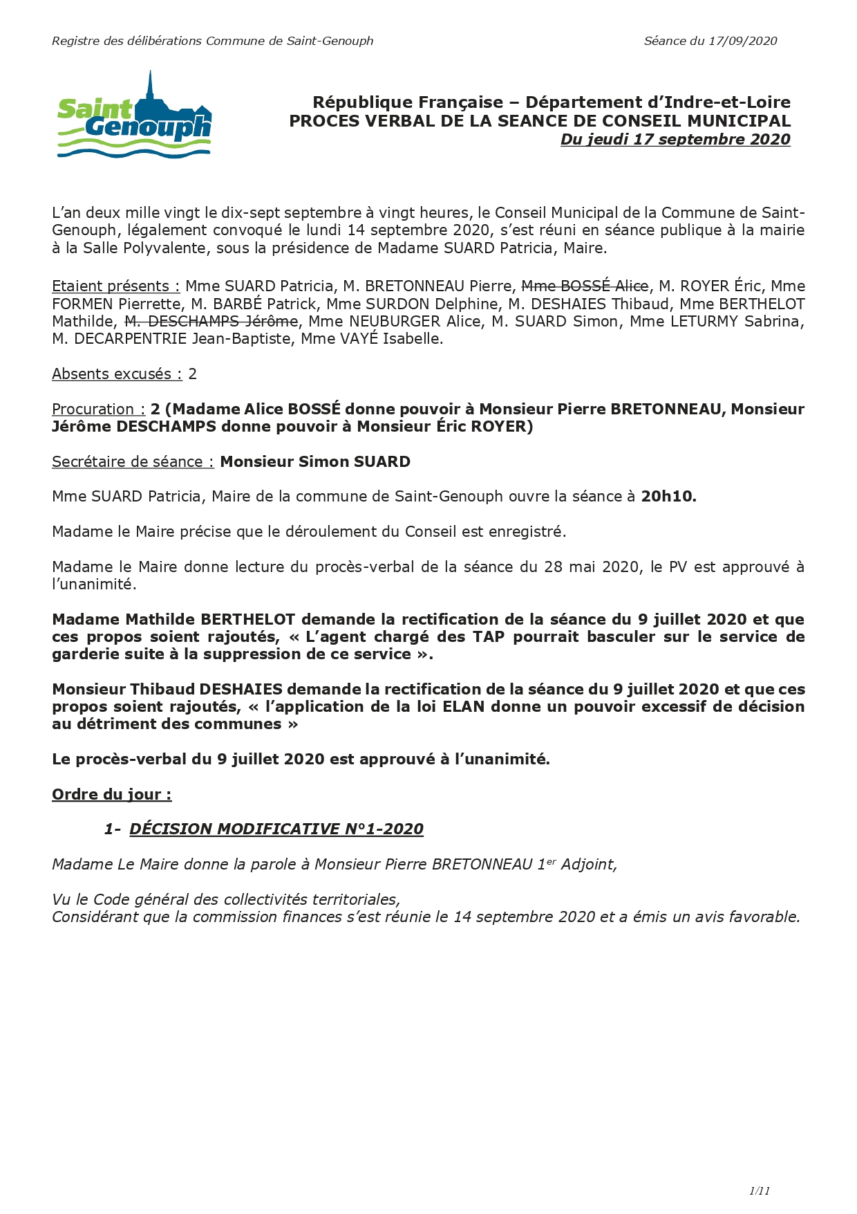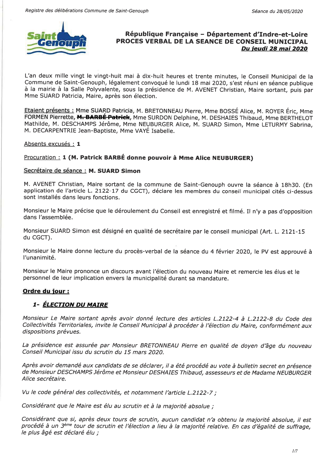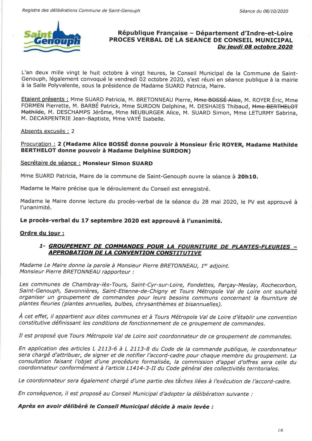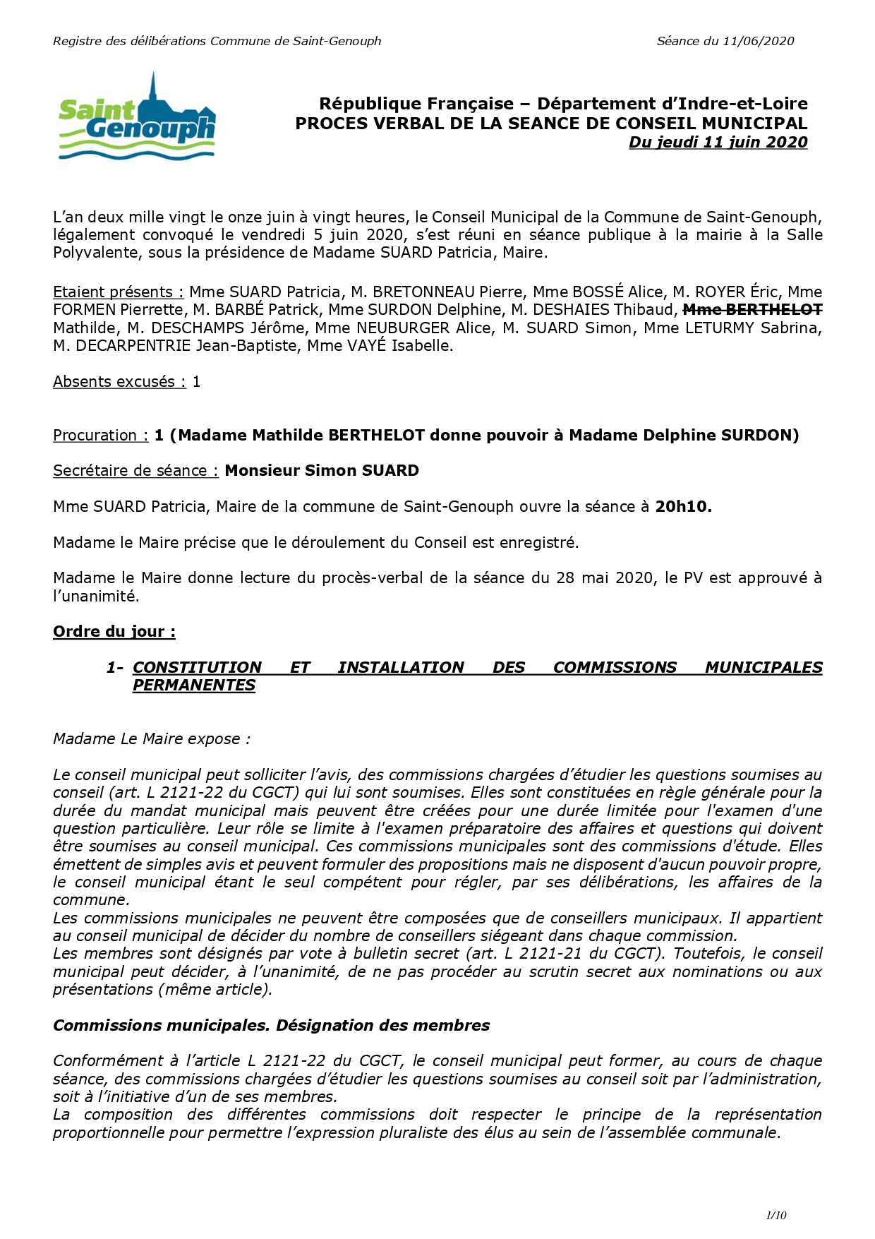 L'année 2020 : conseils municipaux de la commune de St Genouph