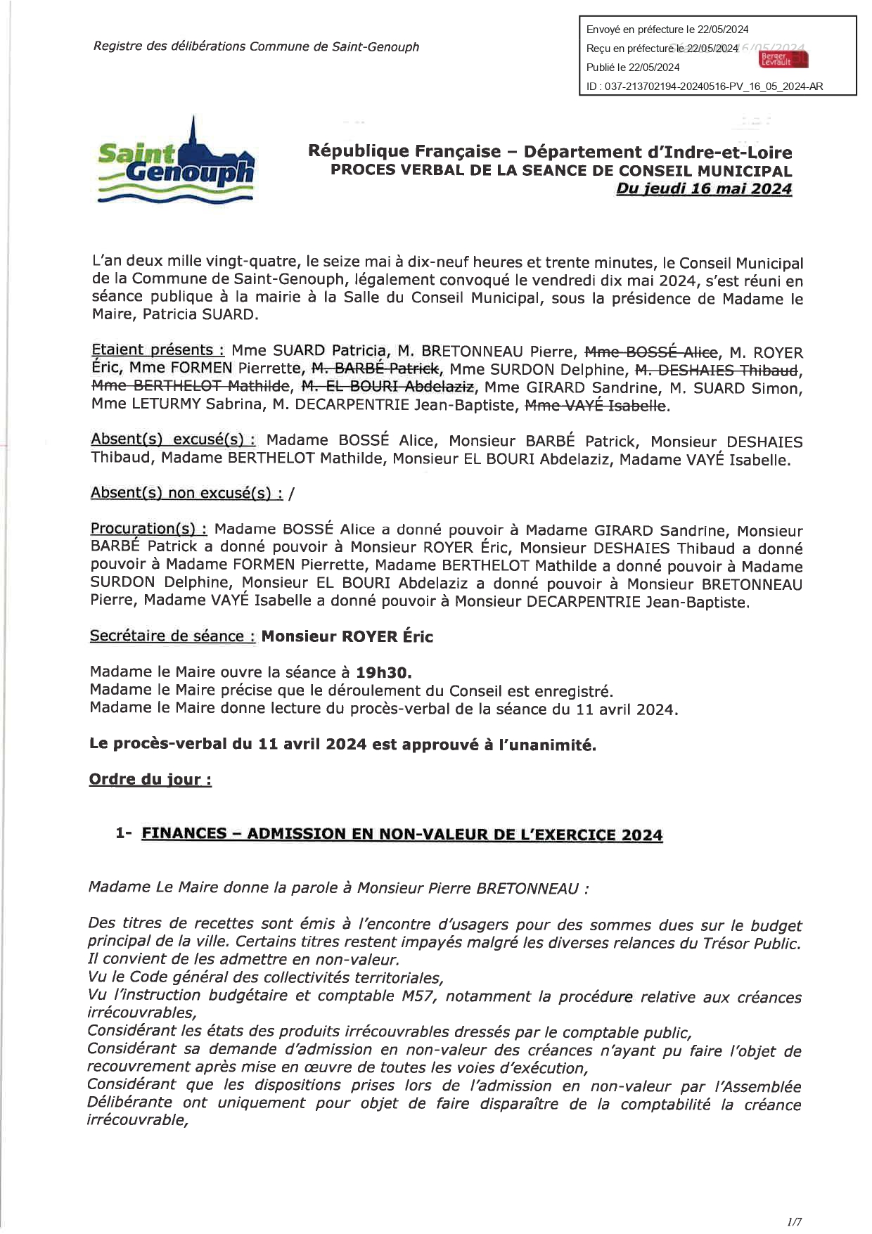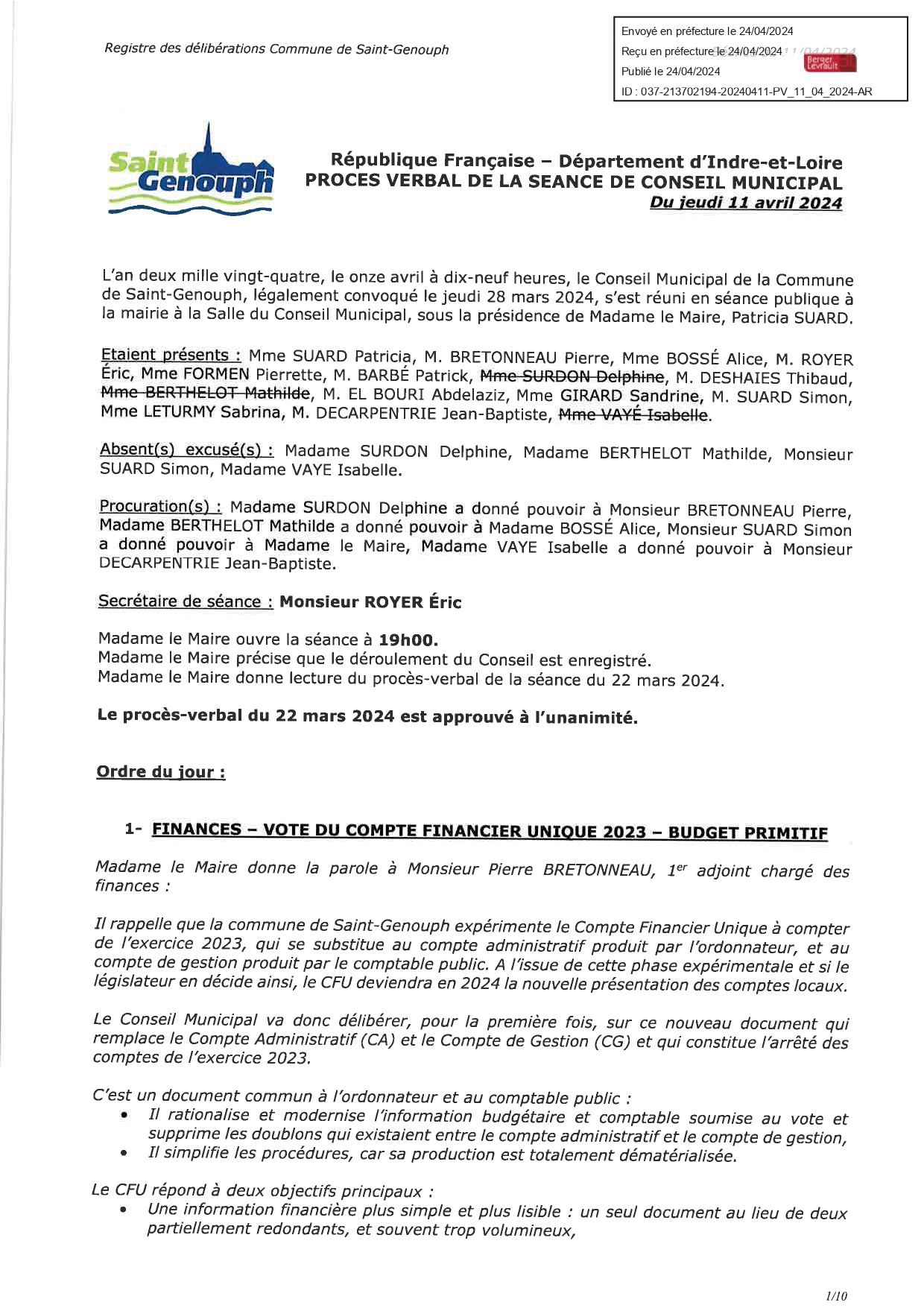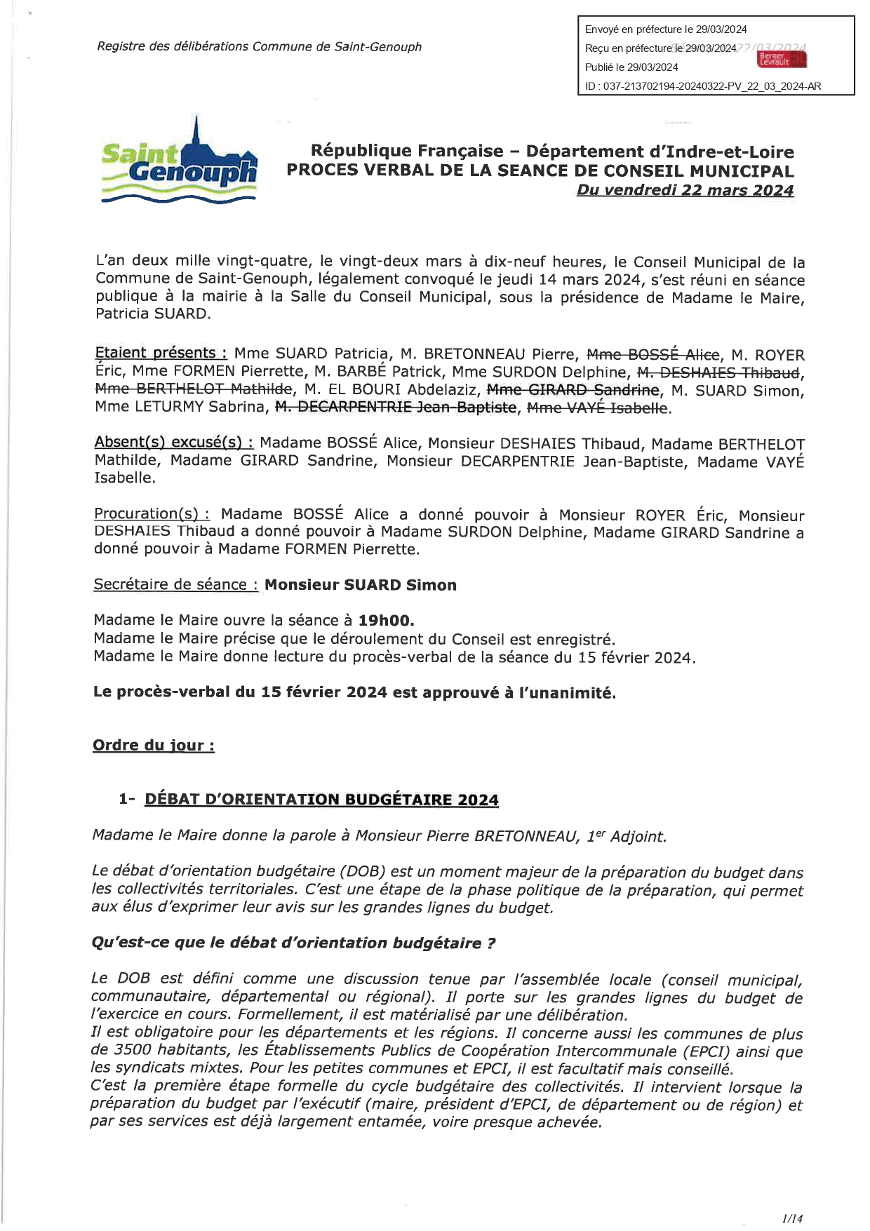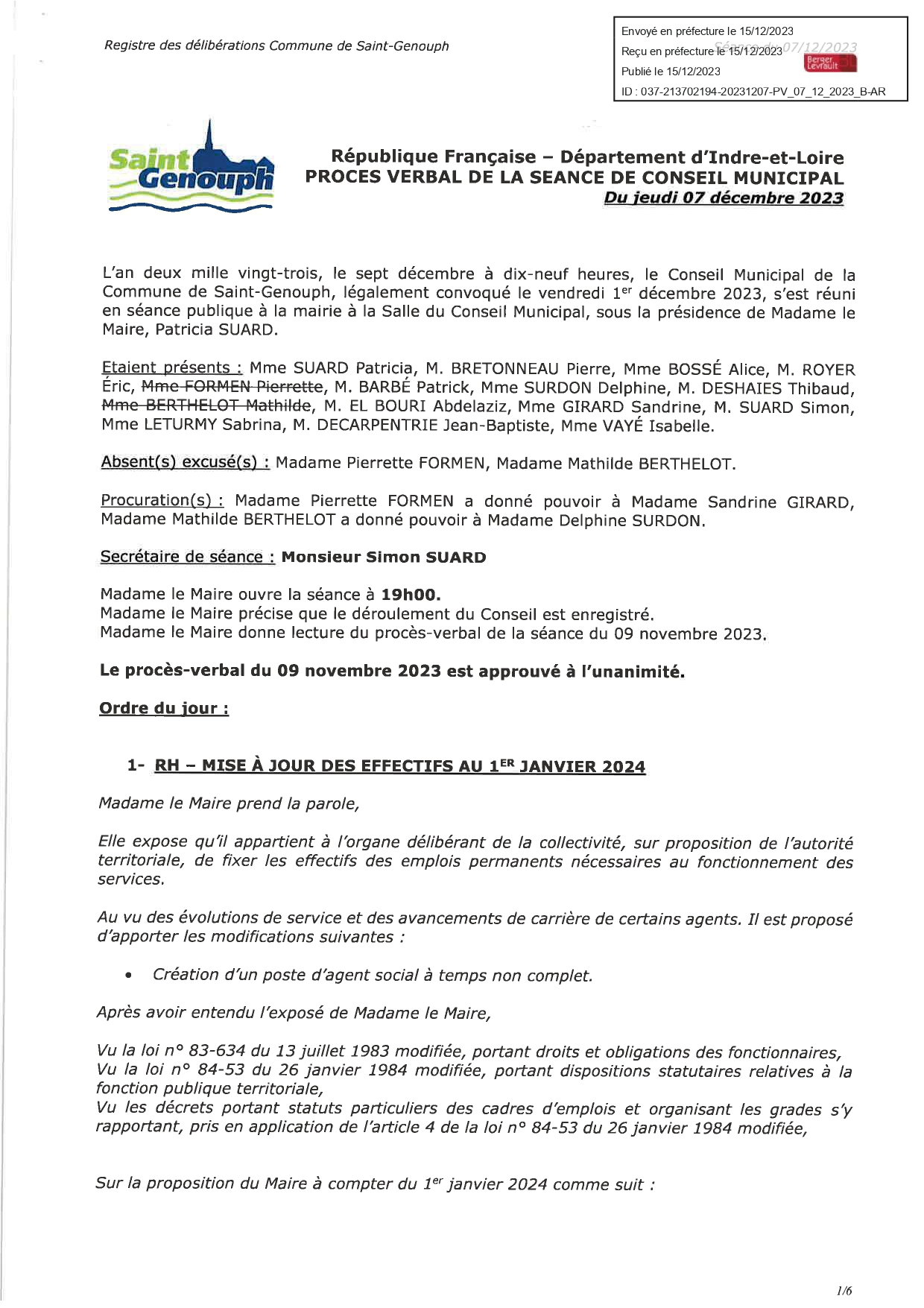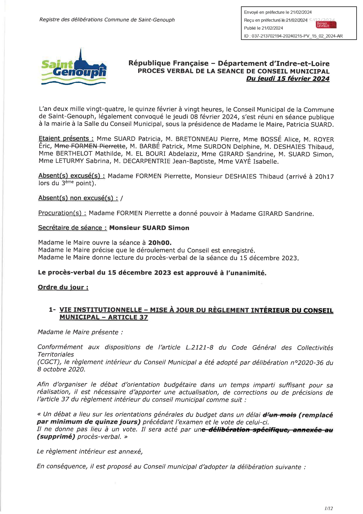 L'année 2024 : conseils municipaux de la commune de St Genouph