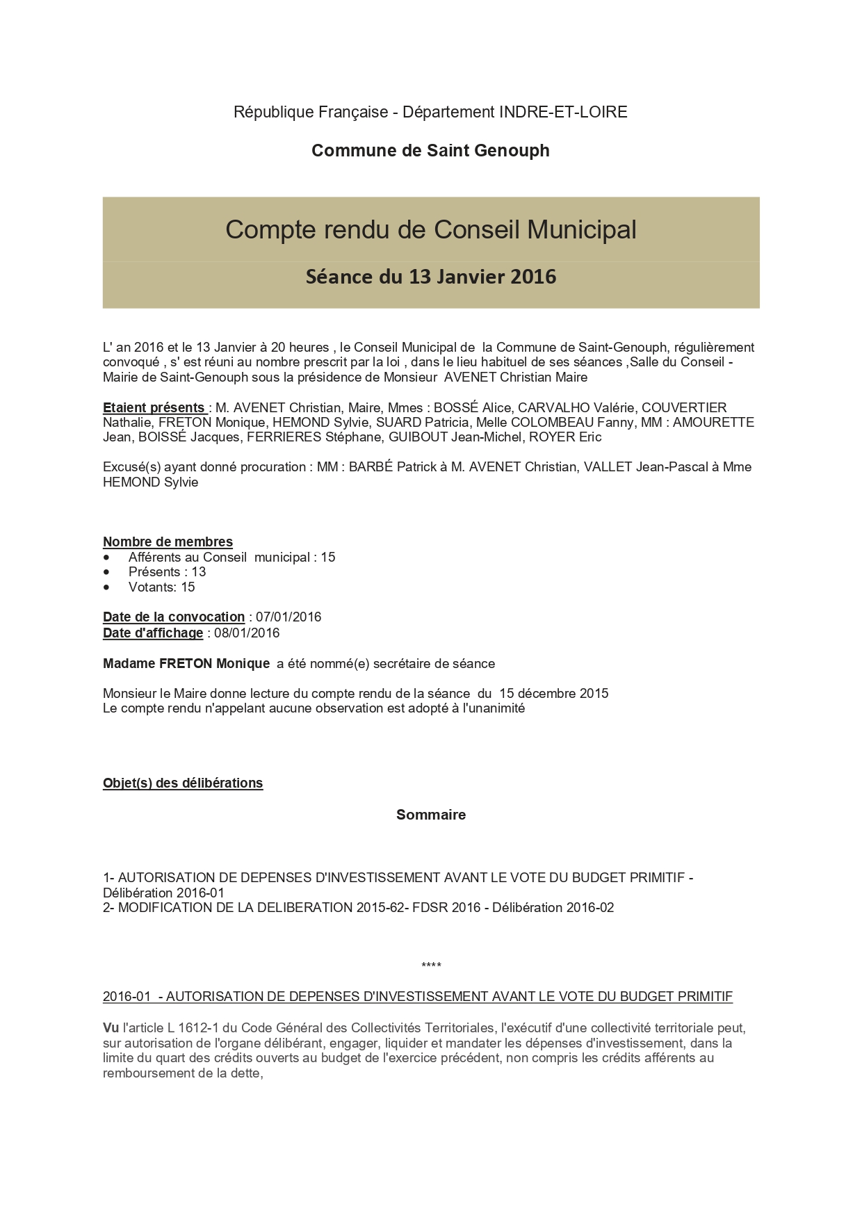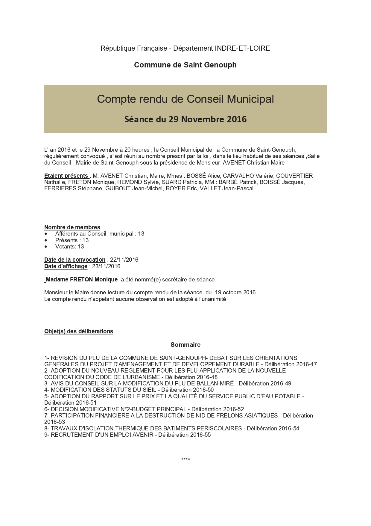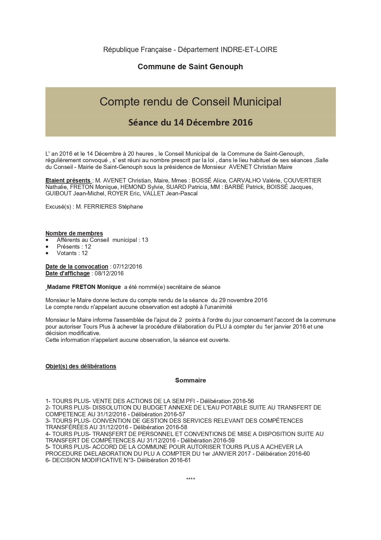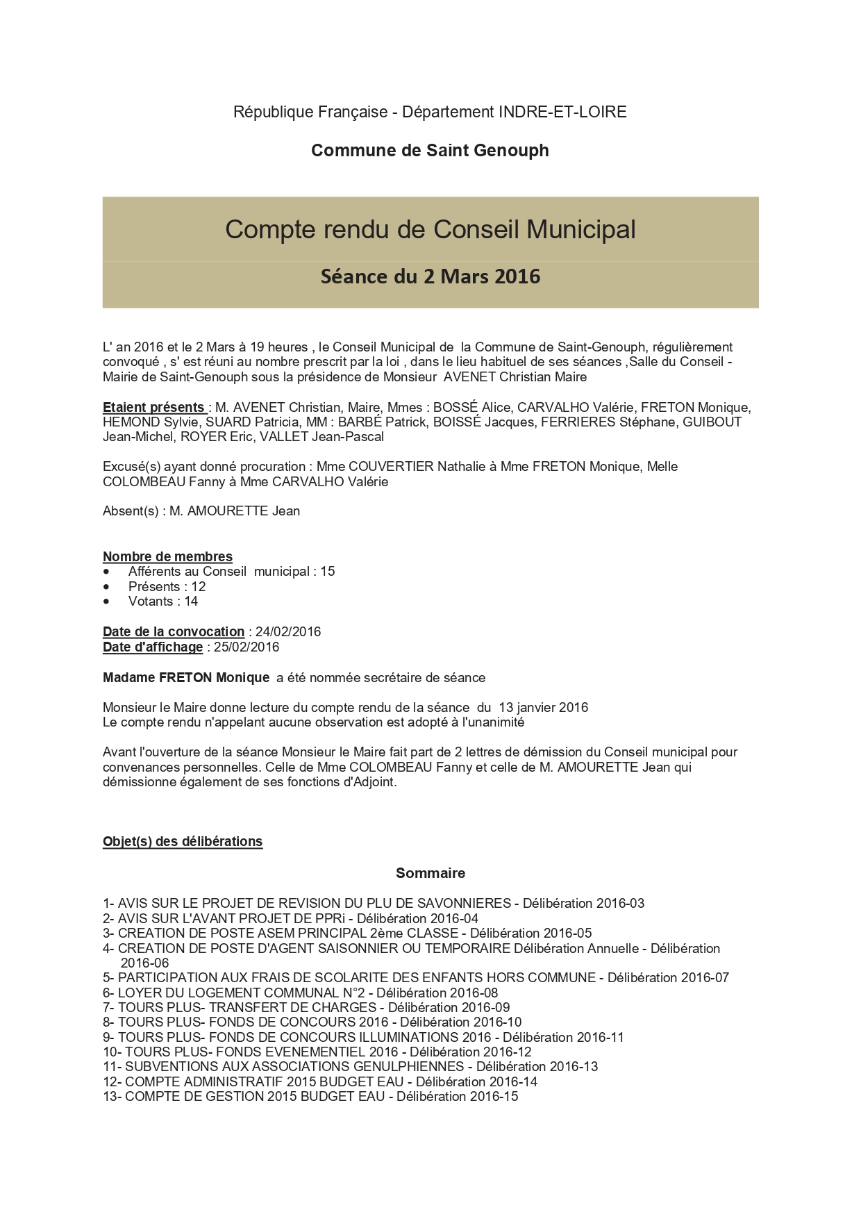 L'année 2016 : conseils municipaux de la commune de St Genouph