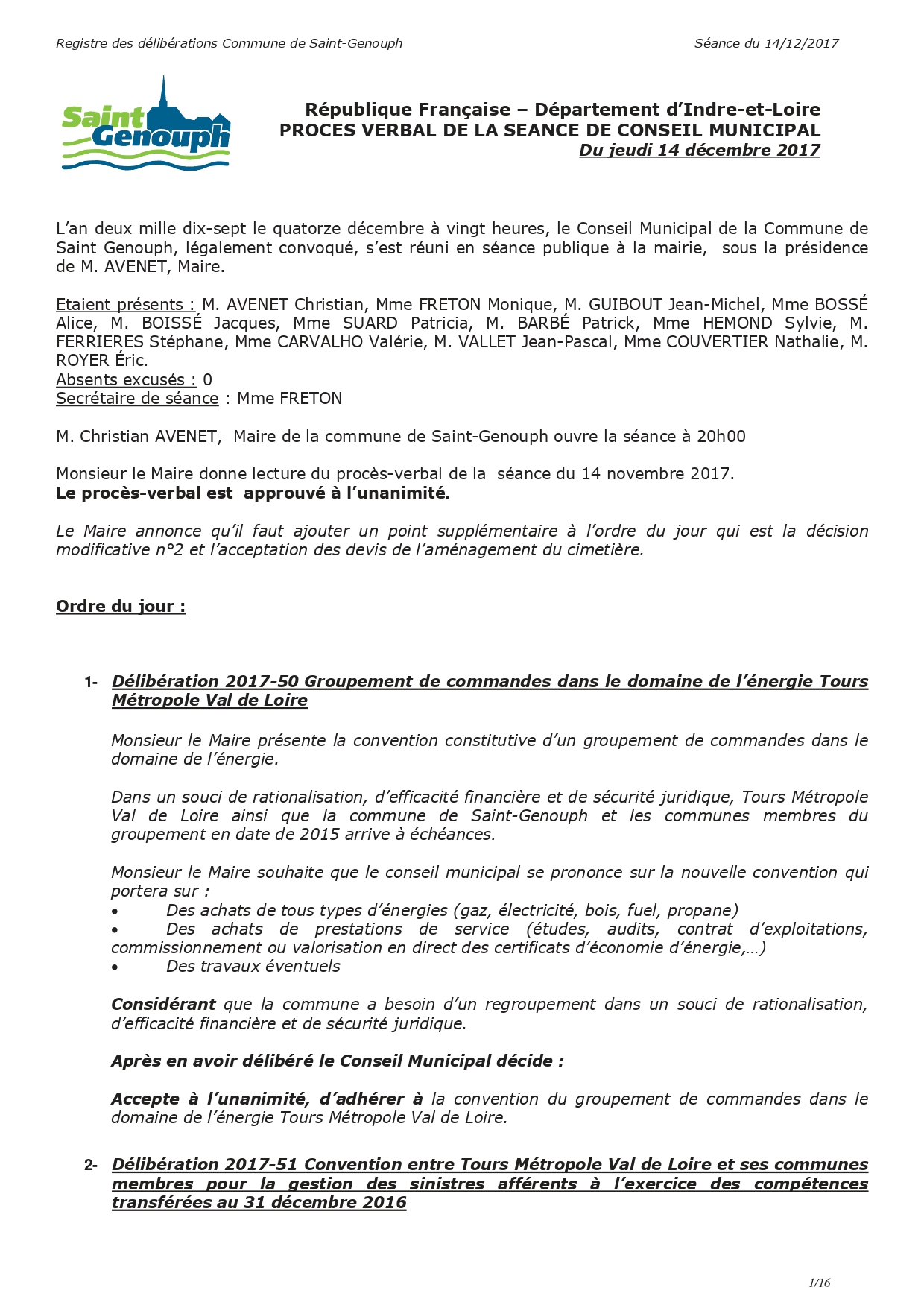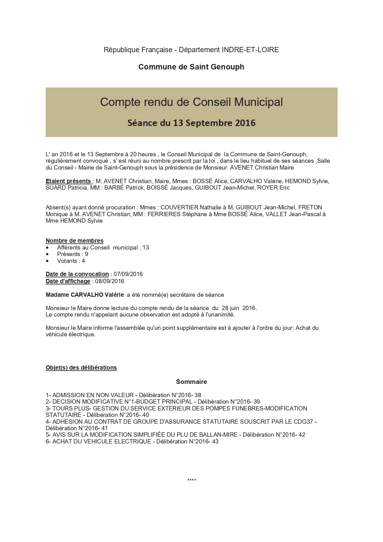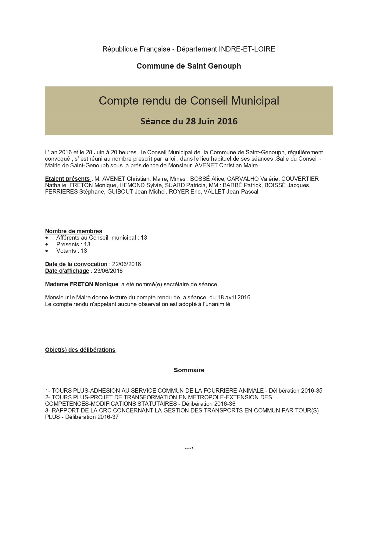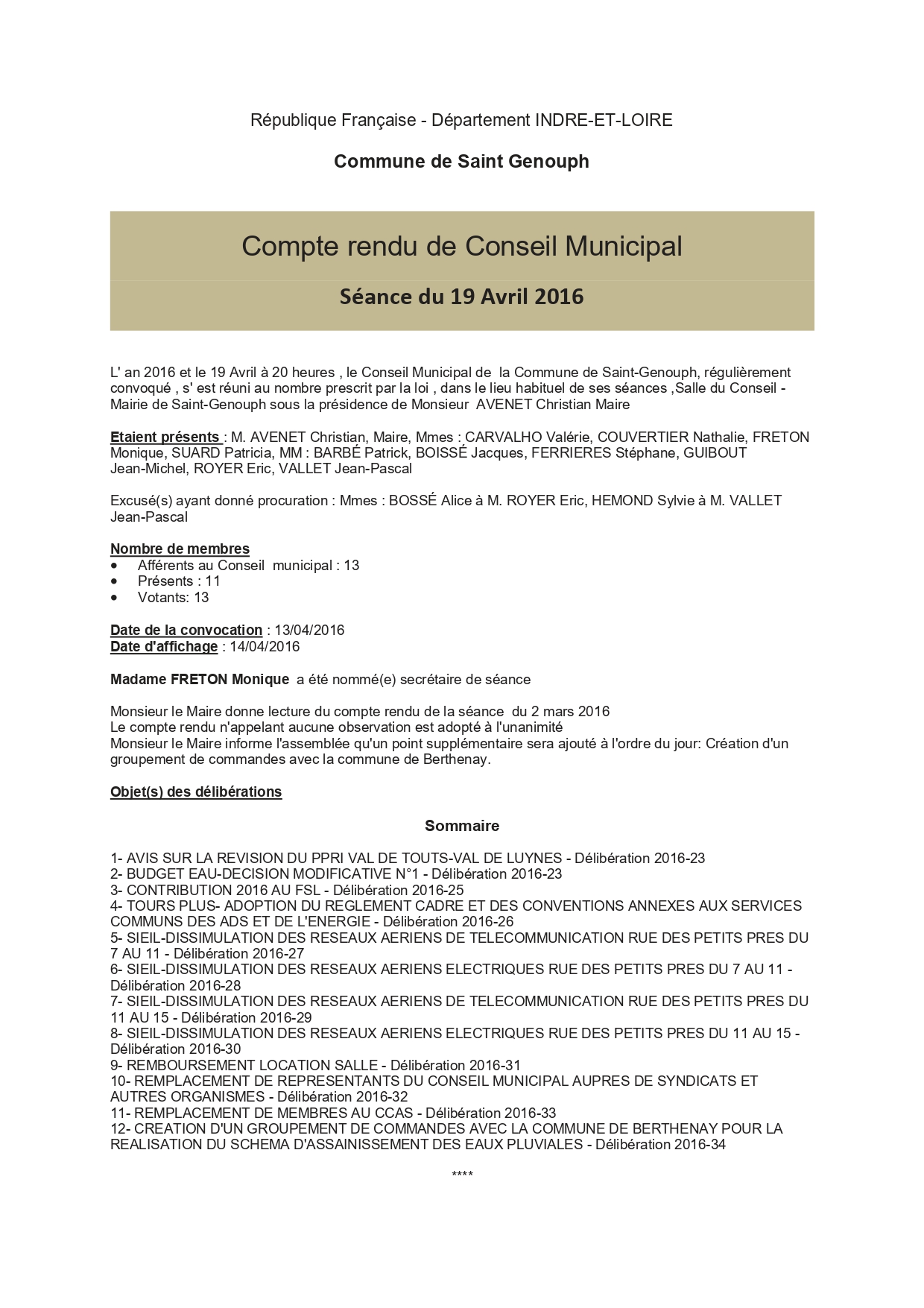 L'année 2016 : conseils municipaux de la commune de St Genouph