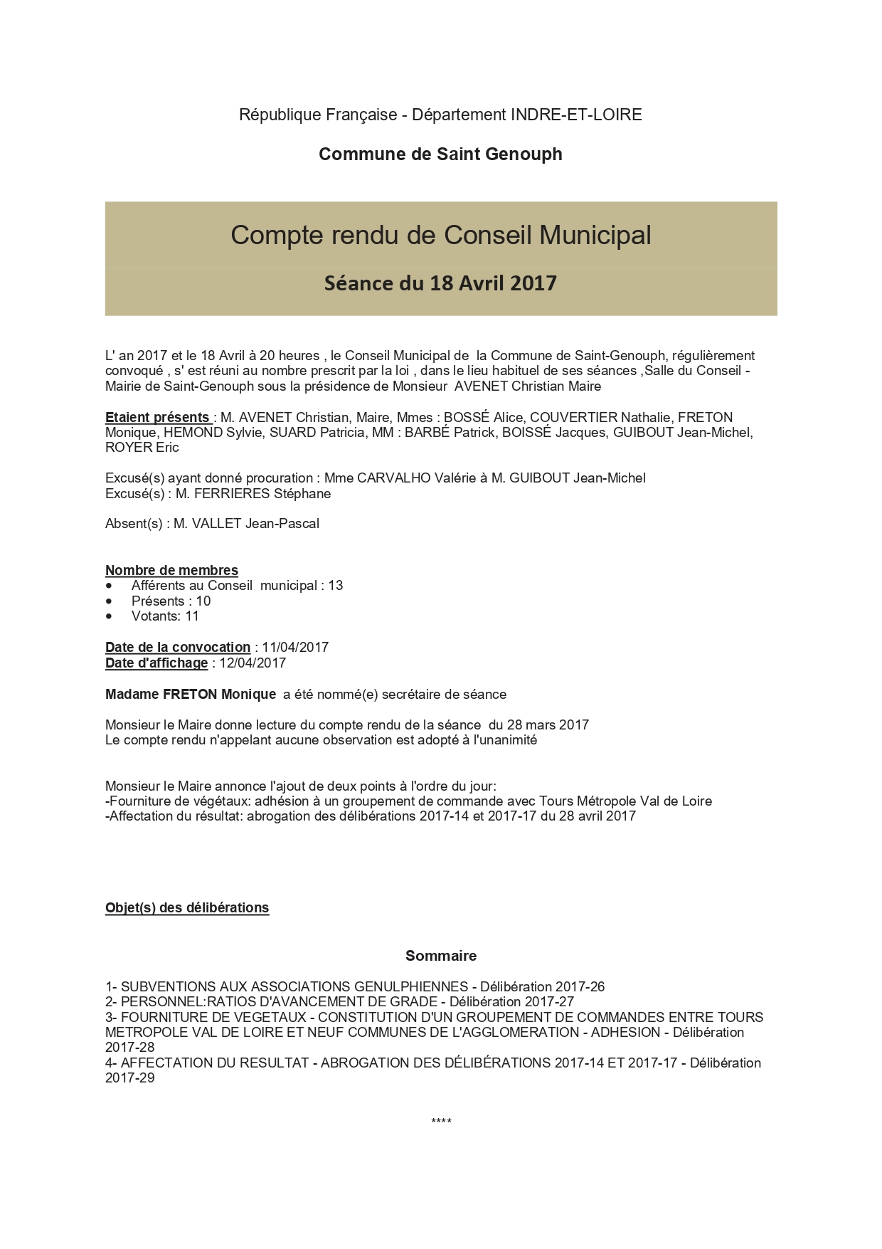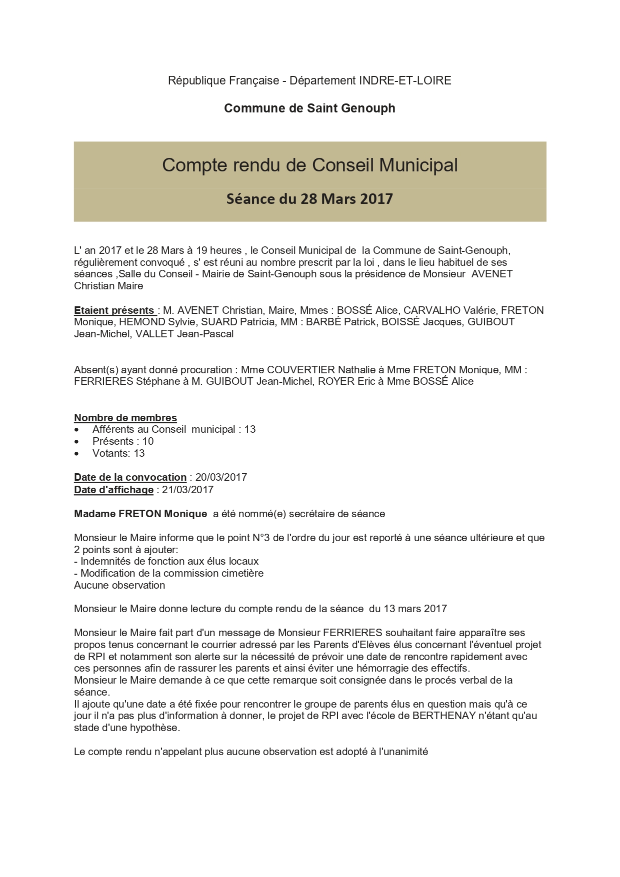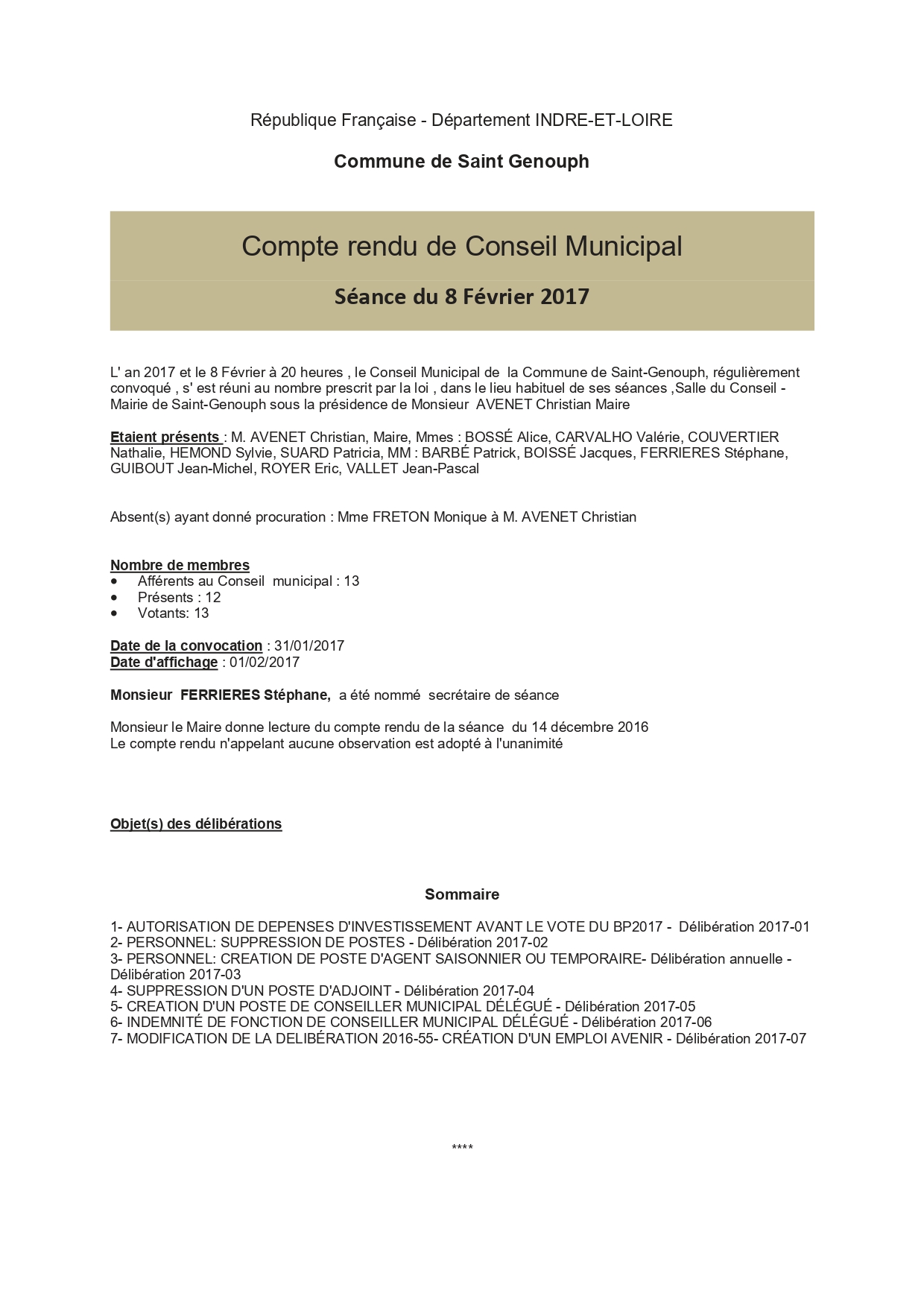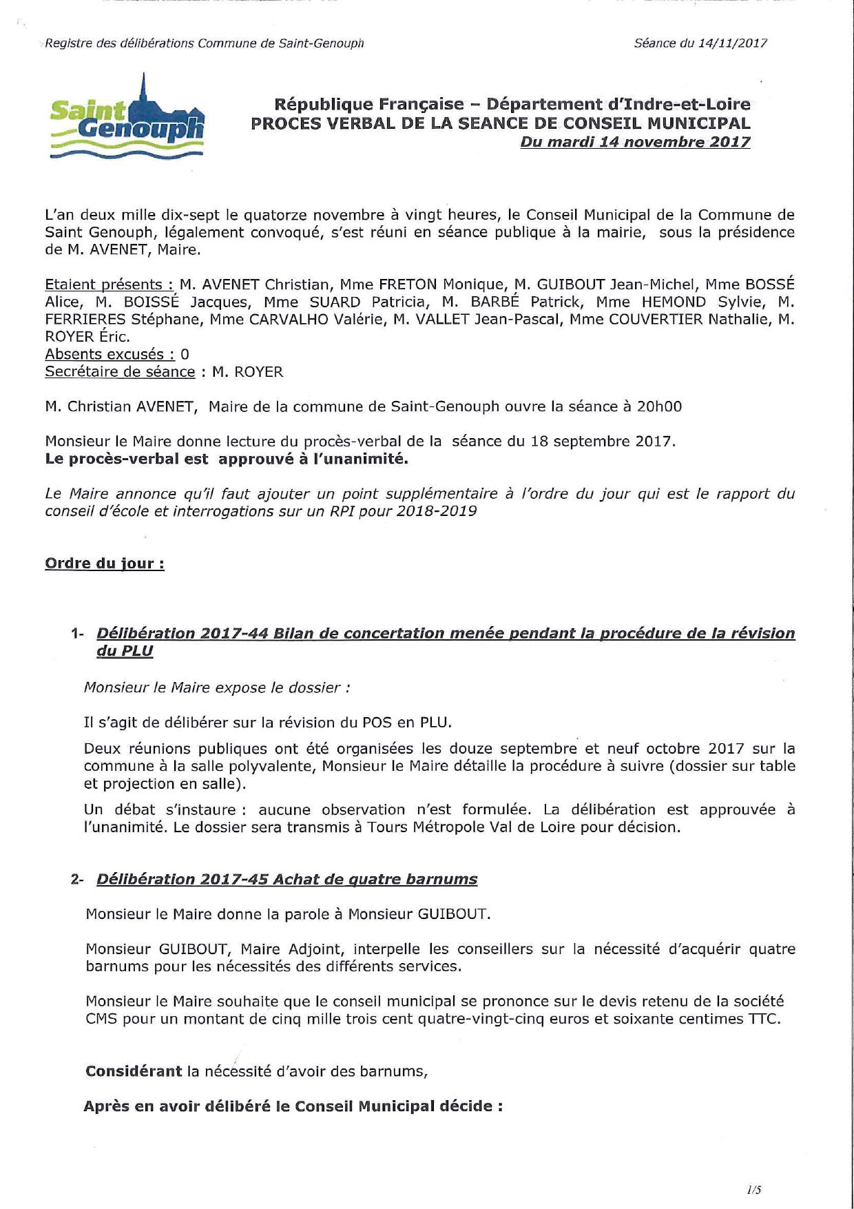 L'année 2017 : conseils municipaux de la commune de St Genouph