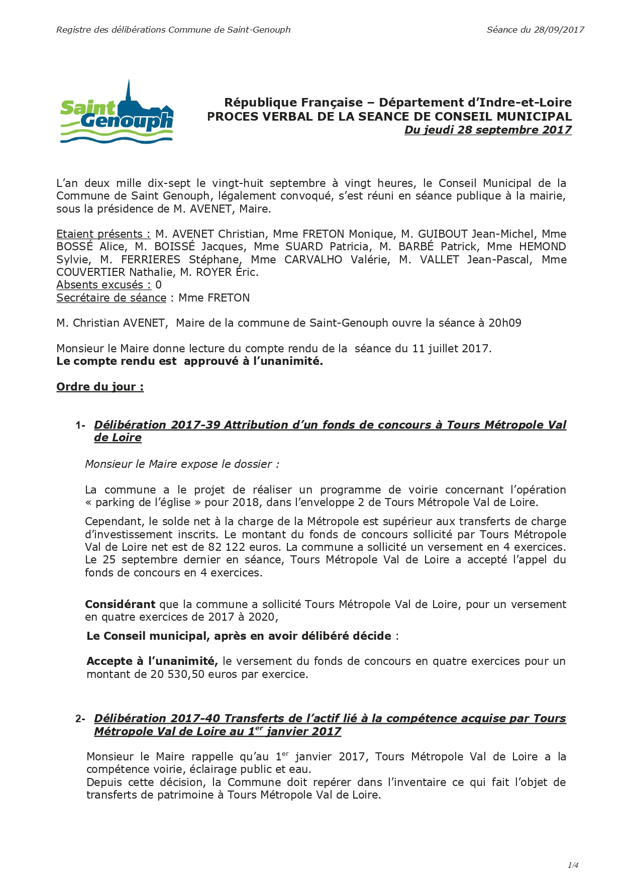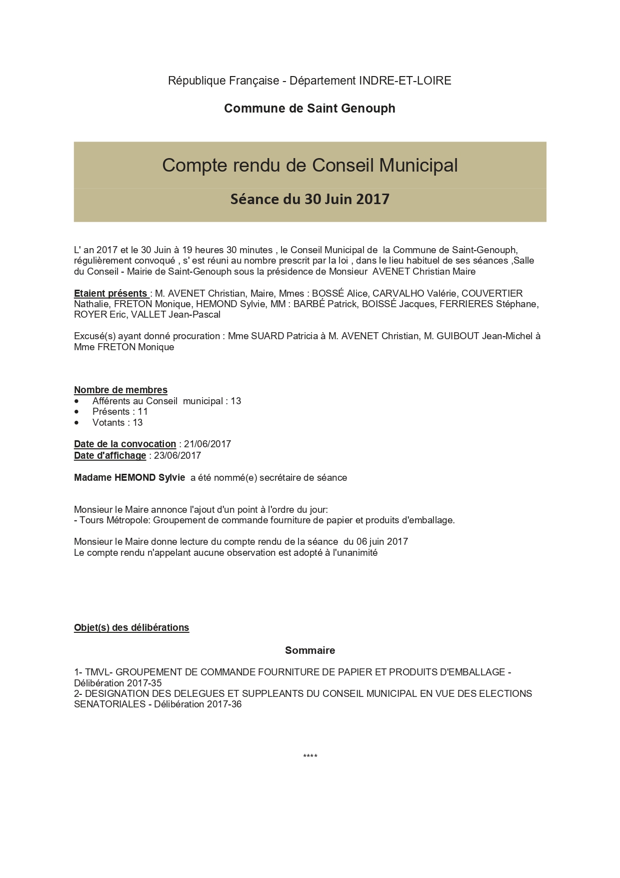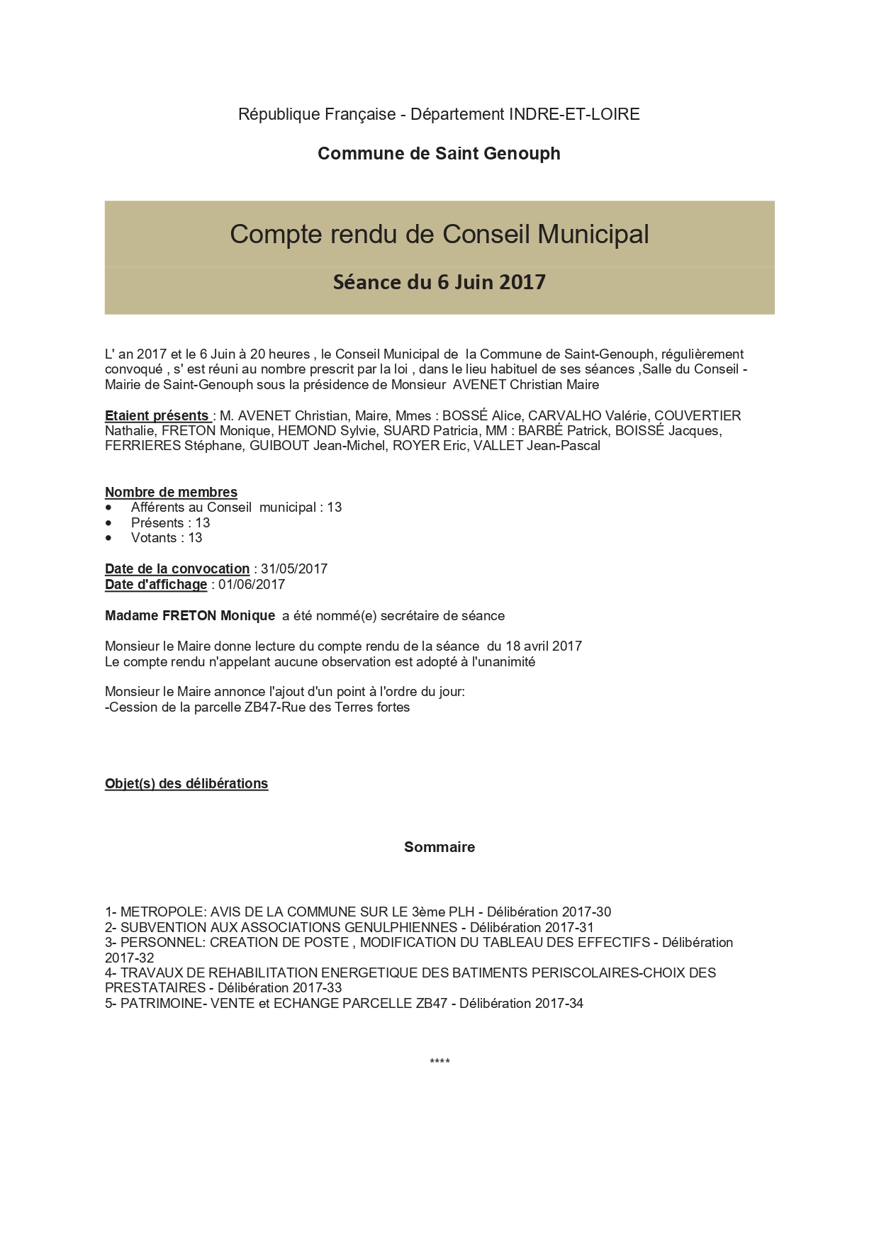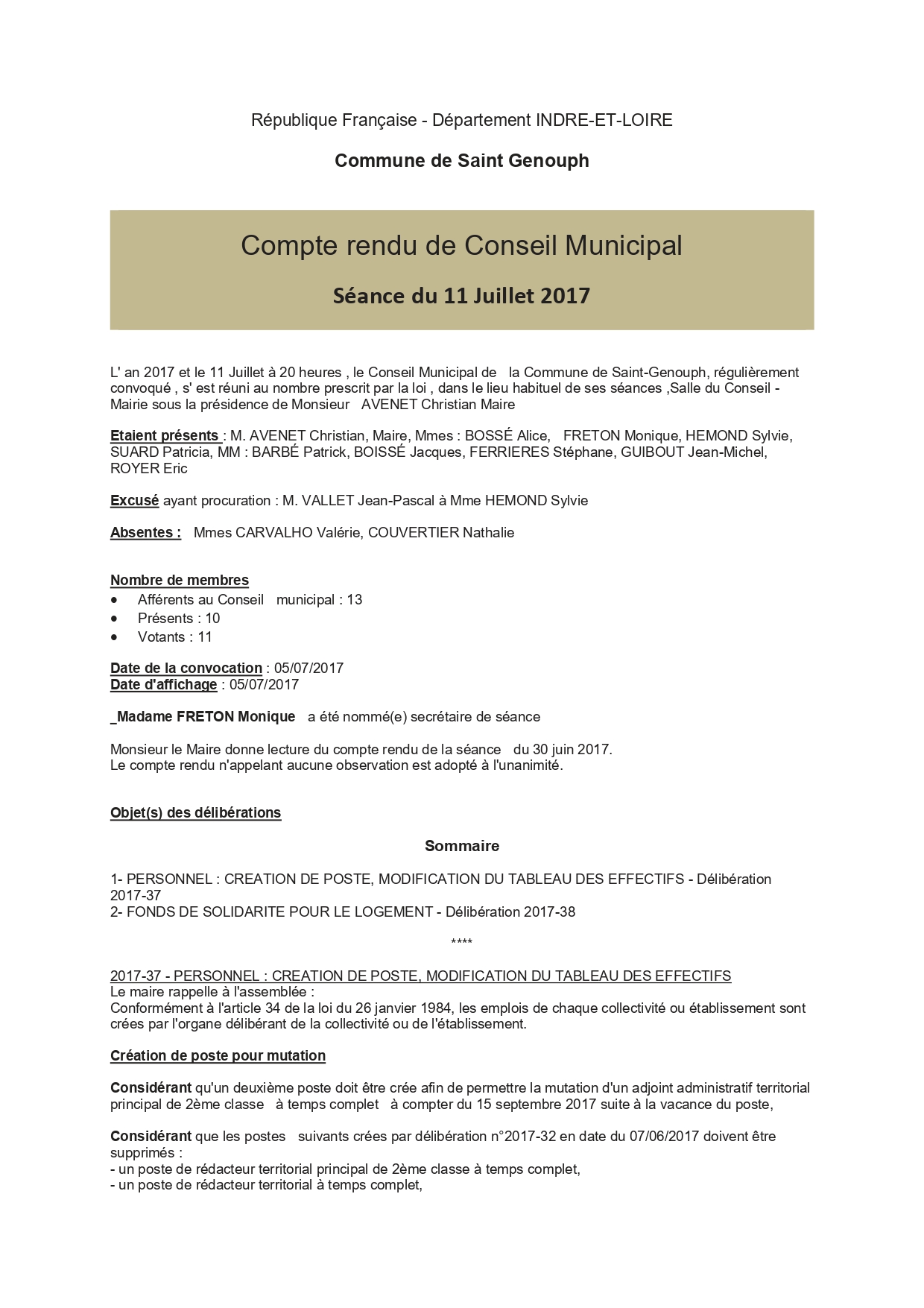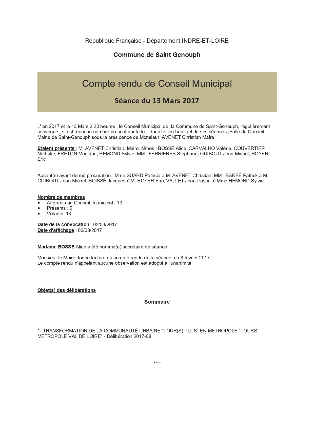 L'année 2017 : conseils municipaux de la commune de St Genouph
